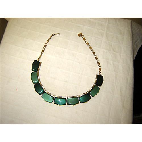 The greens are placed where there is one dark then one lighter. The colors have a moonglow shading. This necklace has the unique decorative extender charm which Lisner is known for.