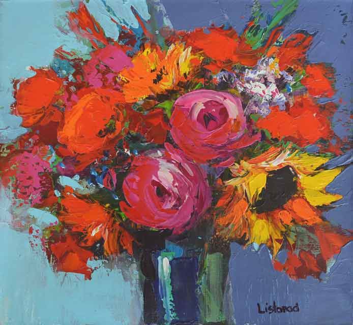 Artist: Natalya Listopad - Title: Bouquet with Sunflower - Medium: Original Acrylic on Canvas - Signature: This one-of-a-kind work is hand-signed by the artist at the bottom of the image - Image Size: Approximately 15.5 inches x 15.5 inches - Unframed on Unstretched Canvas - Details: This work comes with a Certificate of Authenticity - Biography: Natalya Listopad was born in a small village near Kharkov Ukraine in 1957. - Having studied at the Academy of Art in Kharkov, Listopad later joined numerous show groups all over Ukraine. In 2001 she immigrated to Israel with her daughter and her husband, a talented artist in his own right. - Natalya's works are exhibited and collected throughout Ukraine, Israel and USA. -