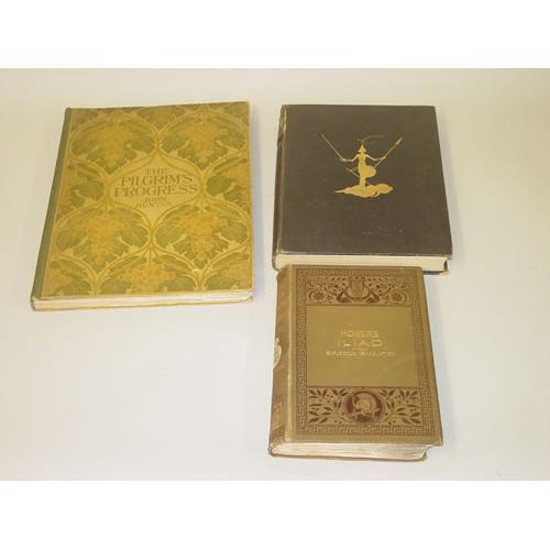 LITERATURE. A Group of 3 Volumes as Listed. Hard Cover. Ex-Library. Good Condition. ***The History of Don Quixote De La Mancha by Miguel De Cervantes, based on Shelton's Translation of 1620 with Illustrations by Jean De Bosschere and an Essay by J.B. Trend (1922) 1st Thus, London: Constable and Company Ltd. NO LIBRARY MARKS. 4to in original cloth binding, color frontis with illustrations throughout. Backstrip wear, front hinge cracked, binding tight. ***Homer's ILIAD. A Burlesque Translation by Thomas Bridges, revised by George A. Smith, with Original Illustrations (1889) 1st Thus, Philadelphia: Gebbie & Co. 8vo in original decorative cloth with bevelled edges, frontis with illustrations throughout. Edge/corner wear, hinges cracked, binding tight. ***The Pilgrim's Progress From This World to That Which is to Come by John Bunyan, Embellished with Over 120 Designs Done by George Woolliscroft Rhead, Frederick Rhead & Louis Rhead (1898) 1st Thus, NY: The Century Co. NO LIBRARY MARKS. Folio in original cloth & paper decorative binding, frontis, illustrated borders on each page, illustrations throughout, deckled page edges. Edge/corner wear, binding & hinges tight