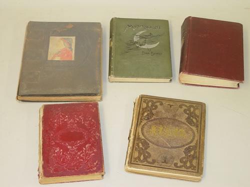 LITERATURE. A Group of 5 Volumes as Listed. Hard Cover. Ex-Library. Poor condition. 12mo to 8vo. ***The New Life or La Vita Nuova by Dante Alighieri, Translated by Dante Gabriel Rossetti, Pictured by Evelyn Paul with Music by Alfred Mercer (circa 1890) Pub: George G. Harrap & Co. 168pp with illuminated illustrations, bound in leather with covers in mediaeval style - with blind stamped letter D, with title and a colored embossed portrait of Dante, 3 riveted hinges, teg. Covers detached, lacks backstrip, first few leaves loose, protected in a mylar cover. ***Landscape Album, with 10 engraved views, leather bound with blind stamping, aeg. Covers detached, lacks most of backstrip, foxing. ***Moonblight and Six Feet of Romance by Dan Beard with illustrations by the Author (1892) Charles L. Webster and Co. Bound in illustrated green cloth, pages on glossy paper, hinges cracked. ***Doctor Syntax's Three Tours in Search of the Picturesque, of Consolation, and of a Wife by William Combe (1895) London: Chatto & Windus. Library binding, COLOR ILLUSTRATIONS, a few pages loose, binding tight. ***Friendship's Offering: A Christmas, New Year and Birthday Present for MDCCCLIII (1853) Philadelphia: E.H. Butler & Co. Bound in maroon leather with tooled designs on both covers, aeg, double frontis w/tissue guard, lacks backstrip, covers detached.