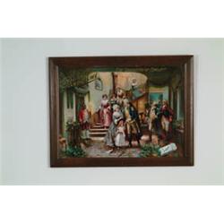 Lot # 487 LITHO ON TIN ADVERTISEMENT FOR PIEDMONT CIGARETTES; GEORGE AND MARTHA WASHINGTON. This colorful lithography depicts the reunion of George and Martha Washington at Mt. Vernon. Other officers in the background, a black house servant in the foreground with children on the stairs. With original wood frame. SIZE: 30" w x 23-1/2" h. CONDITION: Fine rust pitting scattered over the surface of the sign. Colors are bright and strong and because of the complexity of the lithography, the pitting is not real obvious from a little distance. A very attractive patriotic sign. 1-29652 (1,000-1,500)