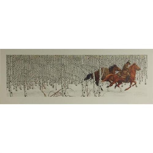 LIMITED EDITION OFFSET LITHOGRAPH 10.5'' x 39''(image size), Bev Doolittle (1947-), CA. ''Sacred Ground''. Plate and pencil signed and numbered 65603/69996 lower right. Unframed. Placed in original Greenwich Workshop sleeve with original documentation. More info. in the white binder. 16.25'' x 43''(sleeve size).