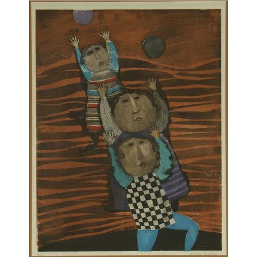 LIMITED EDITION LITHOGRAPH IN COLORS 25'' x 19'', Graciela Rodo Boulanger (1935-), Bolivia/France/CO. Children Playing Ball. Signed lower right. Numbered 70/100 lower left. Matted and placed in a silver metal frame. More info. in the white binder.