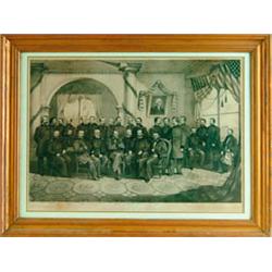 LITHOGRAPH - GRANT AND HIS MEN. About 29" x 21" steel engraving, published by Thomas Kelly and Co., New York, in 1866. Showing twenty-six of the high ranking generals in the U.S. Army during the Civil War. Framed in contemporary frame with old bubbled glass. It has been resealed recently. Print appears in very good condition with only minor foxing. 4-52323 JS52