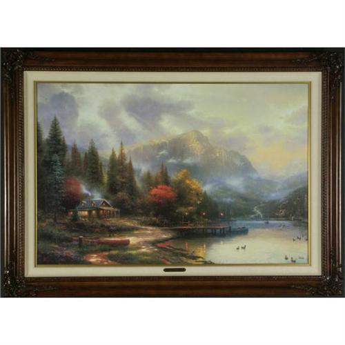 LIMITED EDITION OFF-SET LITHOGRAPH 24'' x 36'', Thomas Kincade (1958-), CA. ''The End of a Perfect Day III''. Signed and numbered ''3031/4950'' lower right. Plate signed lower left. Artist & title plate lower center. Certificate of limitation and authenticity on the verso. Placed in a contemporary wood & compo. frame with off-white matting and gold trim. 31.5'' x 45'' Framed.