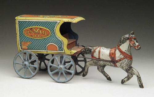 LITHOGRAPHED HORSE DRAWN U.S. MAIL TRUCK. A brightly lithographed wagon in red, yellow, and blue. "U.S. Mail" on both sides. It has blue wheels and a running dapple horse pulling cart. Circa 1900. SIZE: 14" l x 6-1/4" h. CONDITION: Some minor wear. Overall very good condition. 1-4937 MC