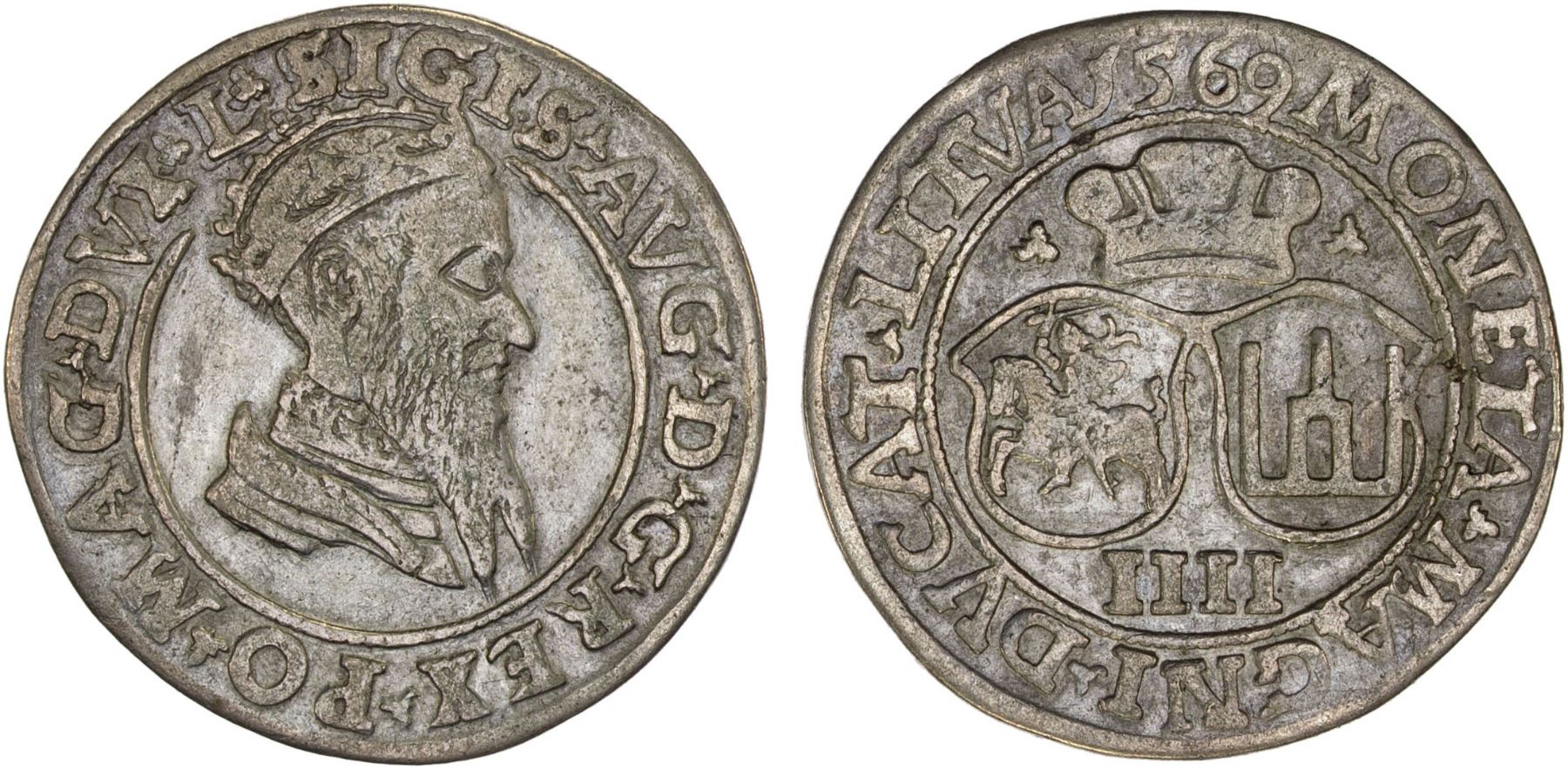LITHUANIA: Zygmunt II August, 1529-1572, AR 4 grosz (groschen) (3.84g), Vilnius, 1569, Kopicki-3315var, Gumowski-624var, crowned bust right with SIGIS AVG D G REX PO MAG DVX L around // crowned two-fold arms with IIII below, all within inner circle with "MONETA MAGNI DVCAT LITVA1569" around, very well struck with full legends, F-VF.