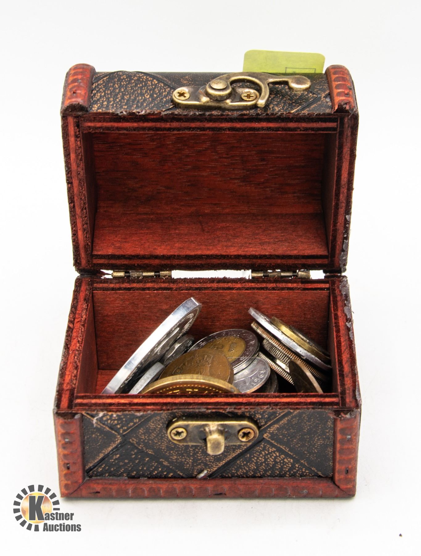 LITTLE CHEST WITH VARIOUS COINS SOME SILVER