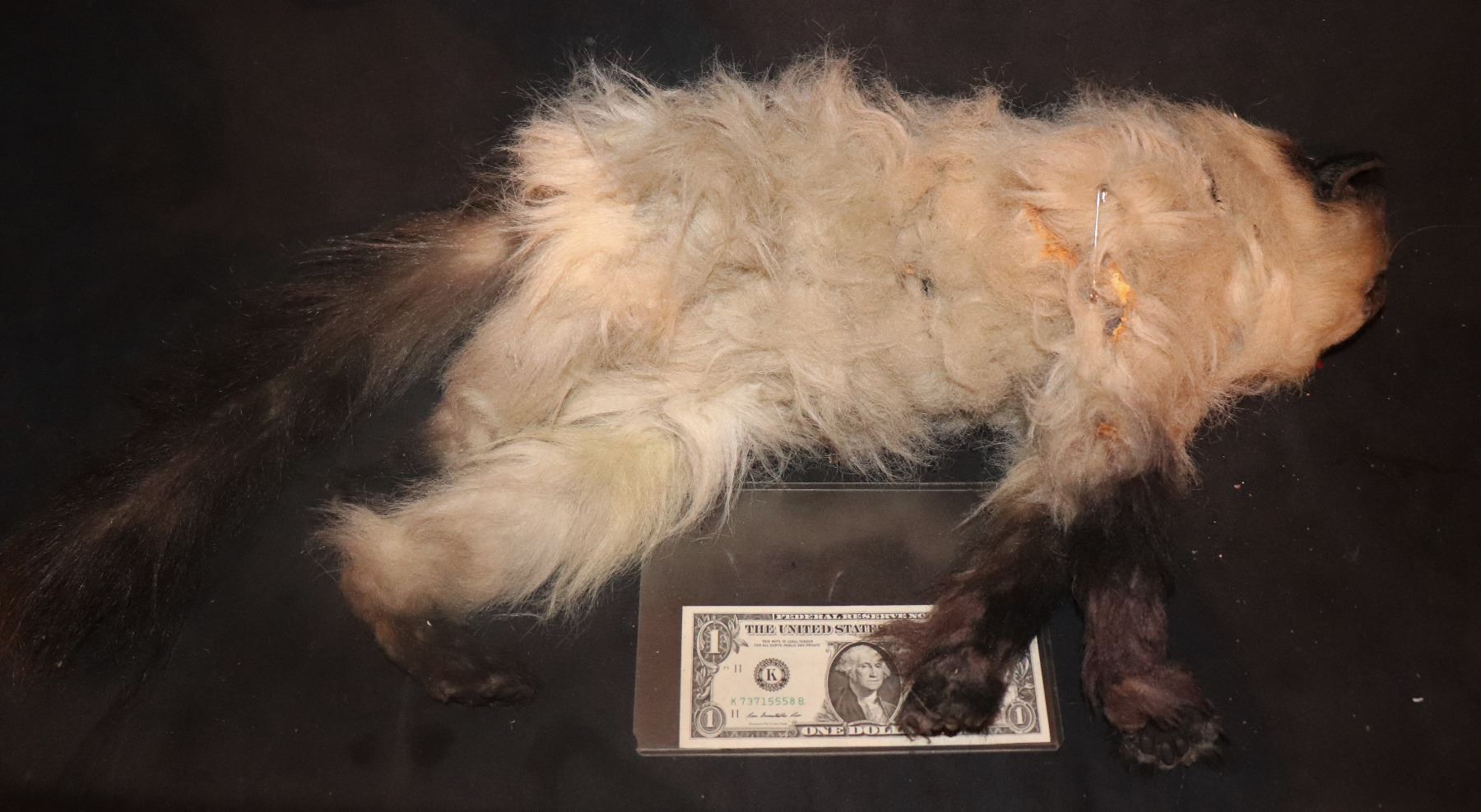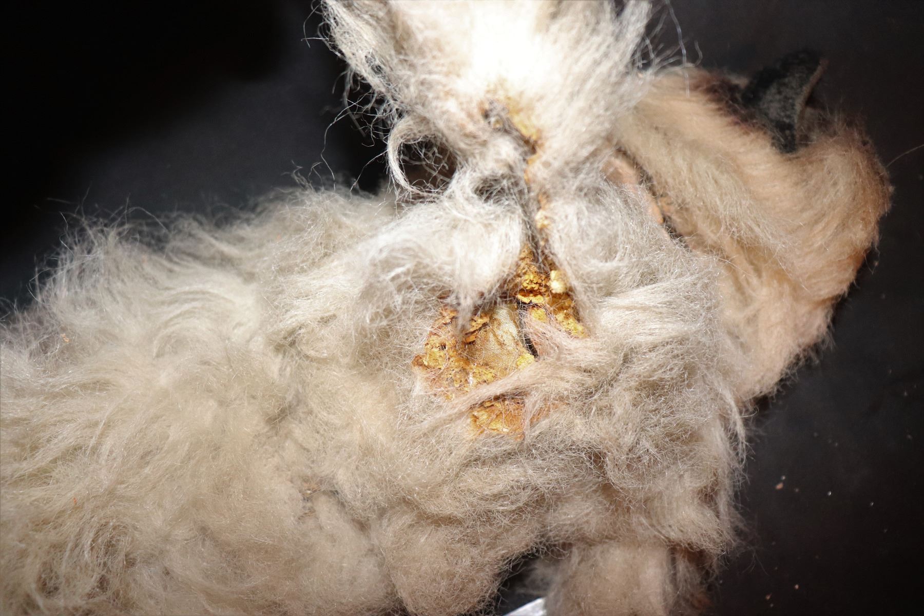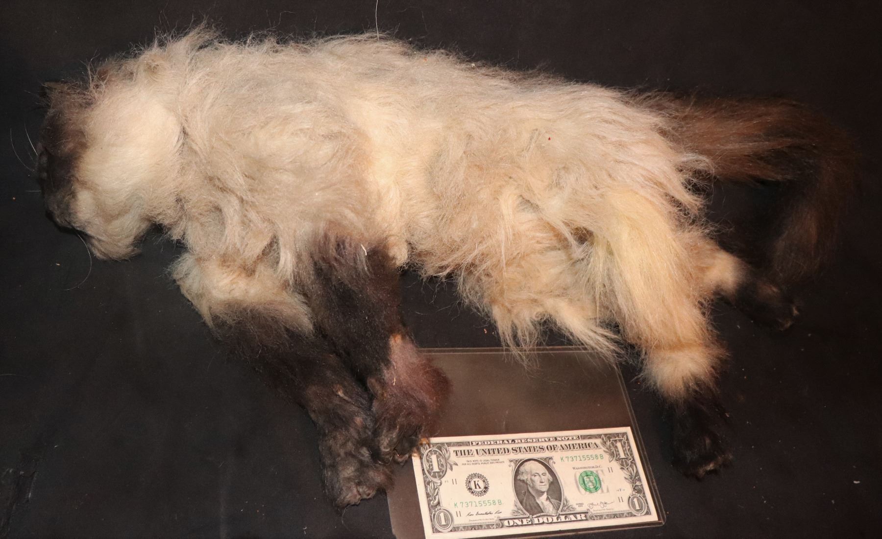 Stuffed fur body with animatronics still in head. He needs a little TLC to display better. The right front leg is loose and he needs a good brushing.