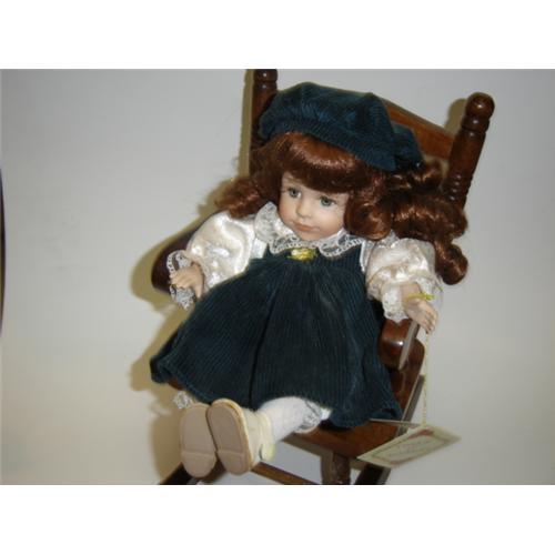 LITTLE PORCELAIN GIRL DOLL. SITTING ON CHERRY WOOD ROCKING CHAIR. SHE HAS BEAUITFUL BROWN CURLS. 12 INCHES ROCKING CHAIR AND 8 INCHES LITTLE SITTING GIRL.