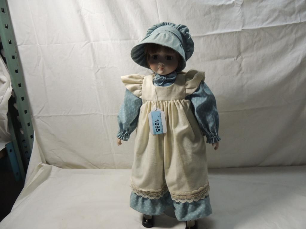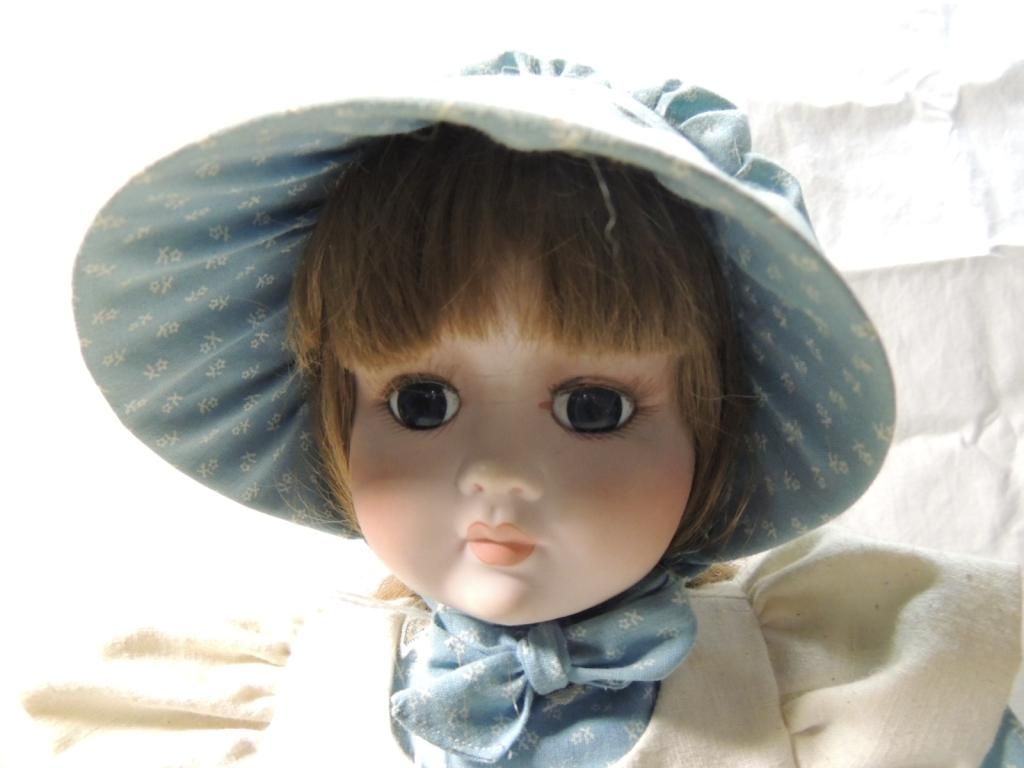 LITTLE HOUSE ON THE PRAIRIE PORCELAIN DOLL. BLUE DRESS WITH BONNET AND WHITE APRON. 22" TALL. AS SHOWN. SEE PHOTO FOR MORE DETAILS.