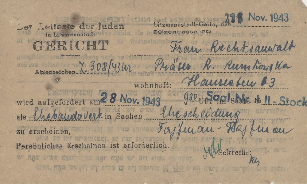 An unusual partly-printed document, 1p. 12mo., Lizamannstadt, Nov. 27, 1943. It notes that: "The Elders of the Jewish Court in Litzmannstadt" require Frau Rechsauwalt [?] and her lawyer Mrs. R. Rumkowska in a divorce case appear in court on Nov. 28, 1943. The verso outlines the consequences for not showing up in person. Rusted staple holes at top left, wrinkled, very good.