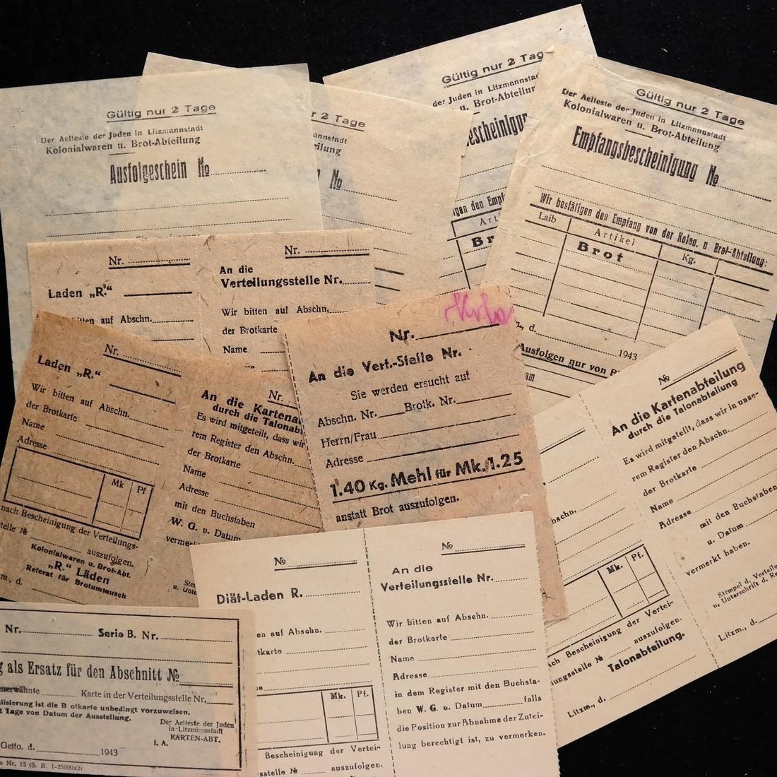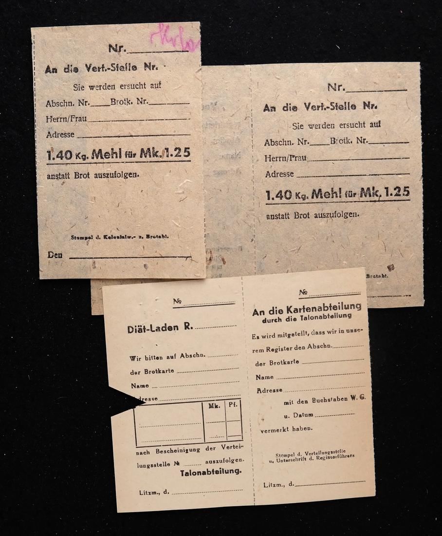 Collection of bread ration receipts and cards, includes different papers and printings, mixed condition but generally sound and F-XF.