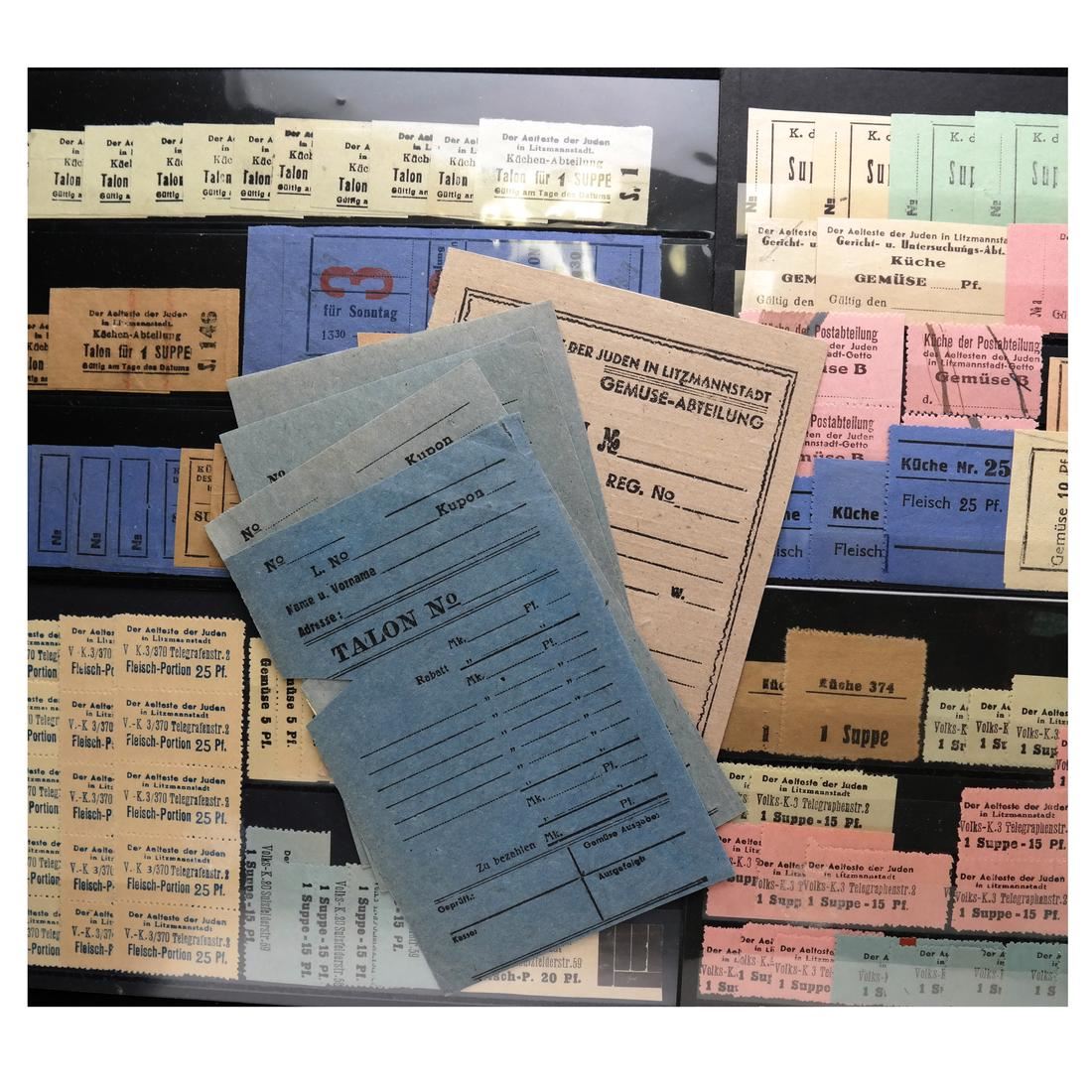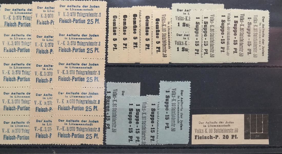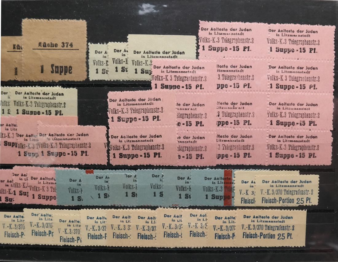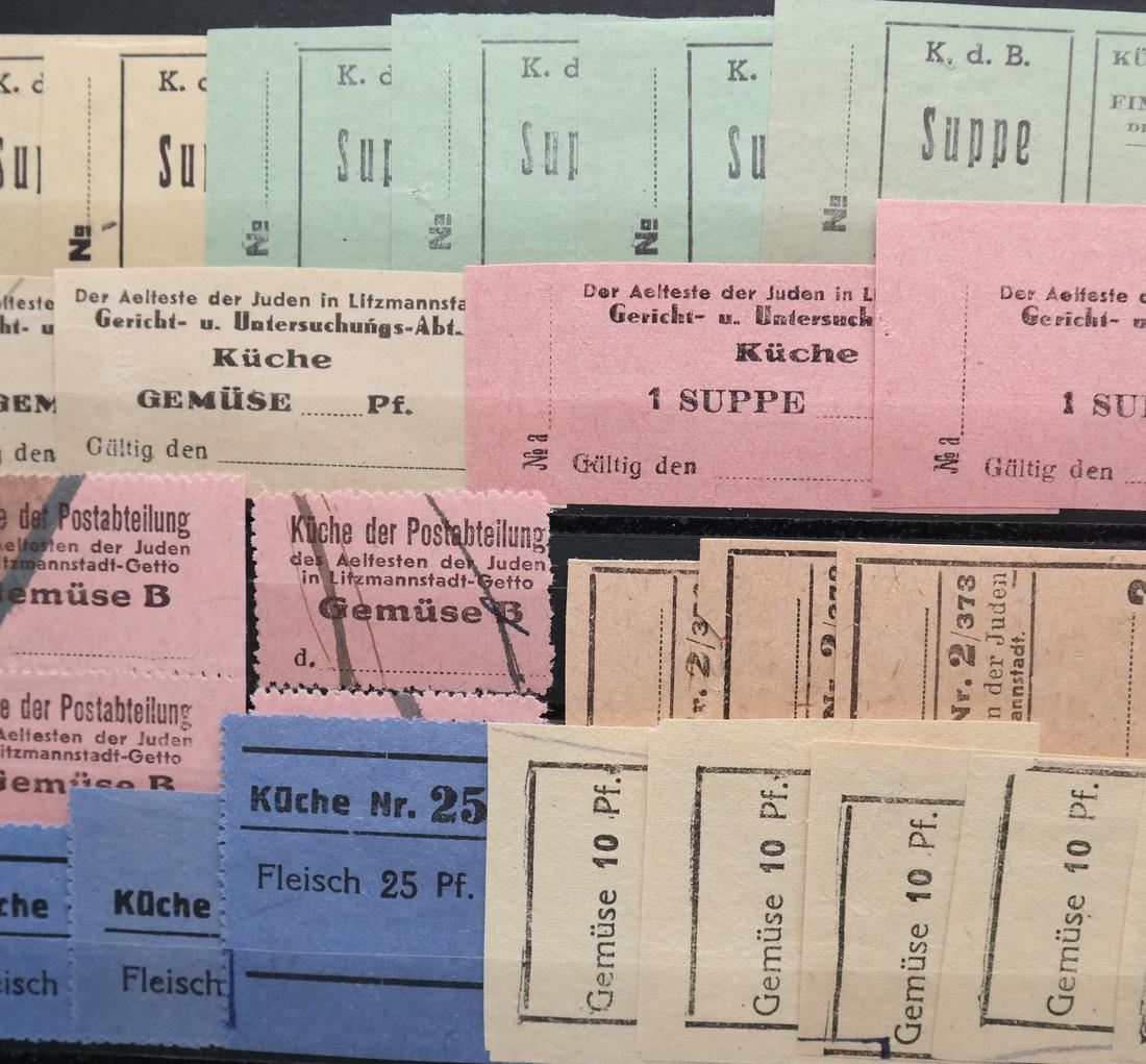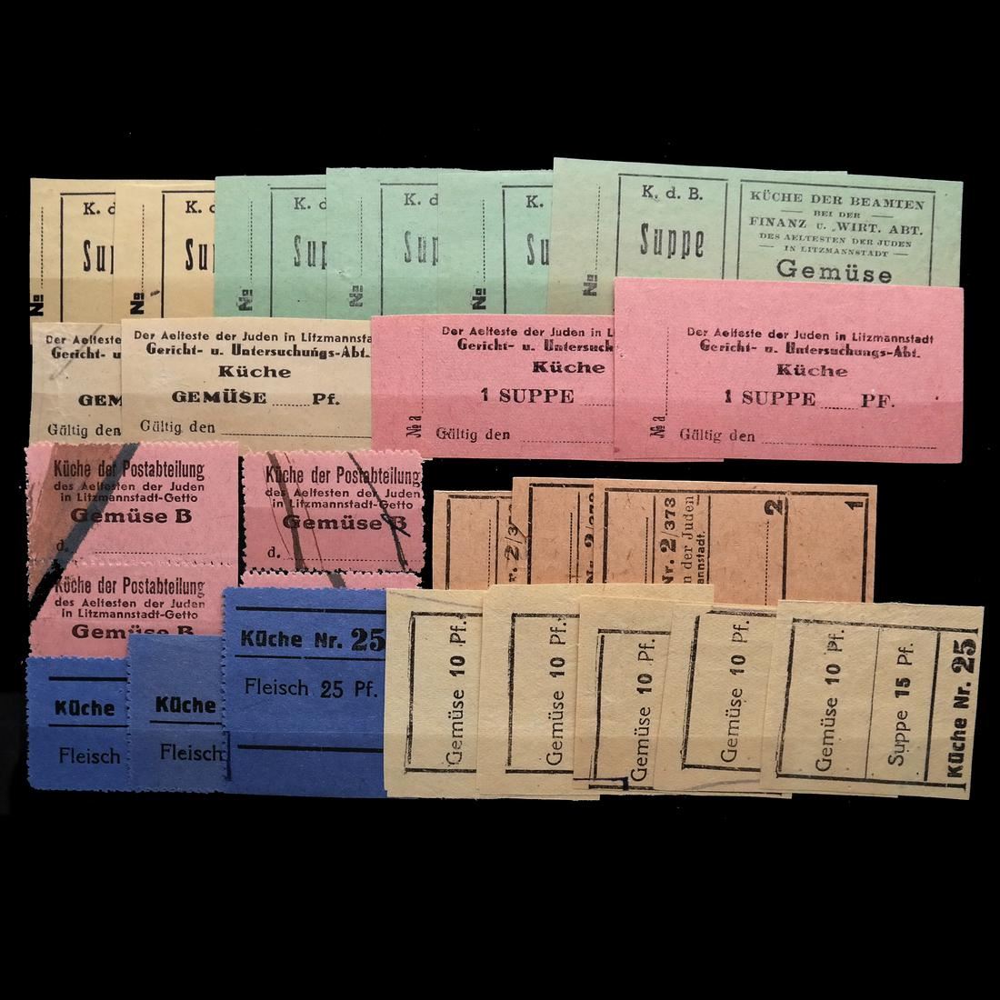 Collection of ration coupons, chits, exchange notes and related items for vegetables, meat and soup from food kitchens, including some mutliples and strips, paper color and type varieties, mixed condition but generally sound and F-XF.
