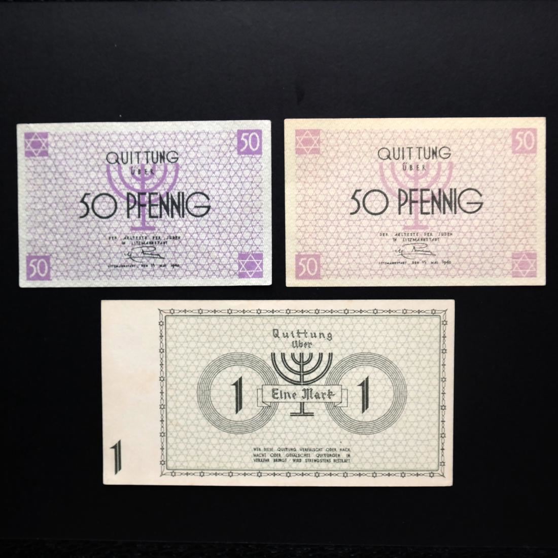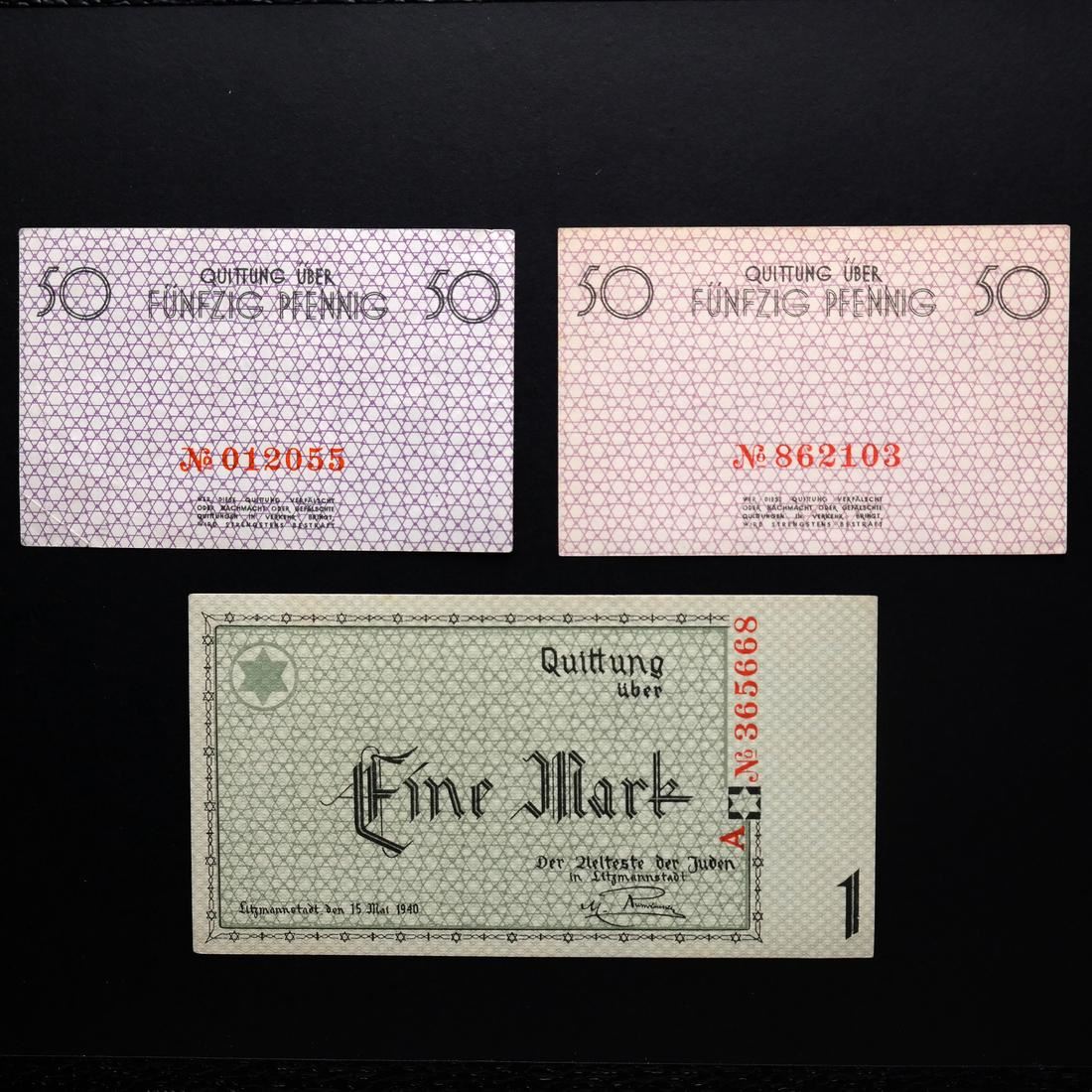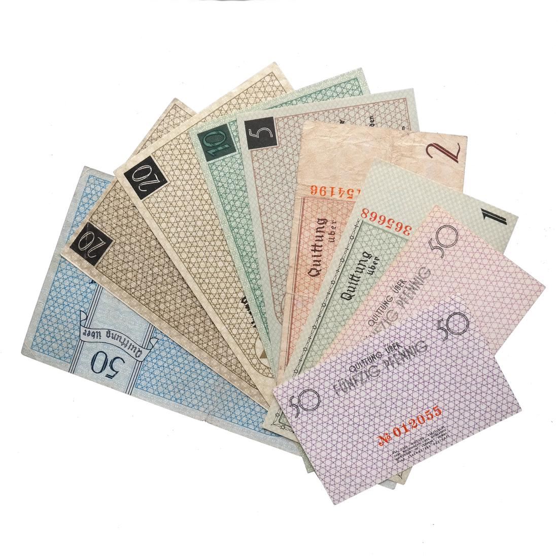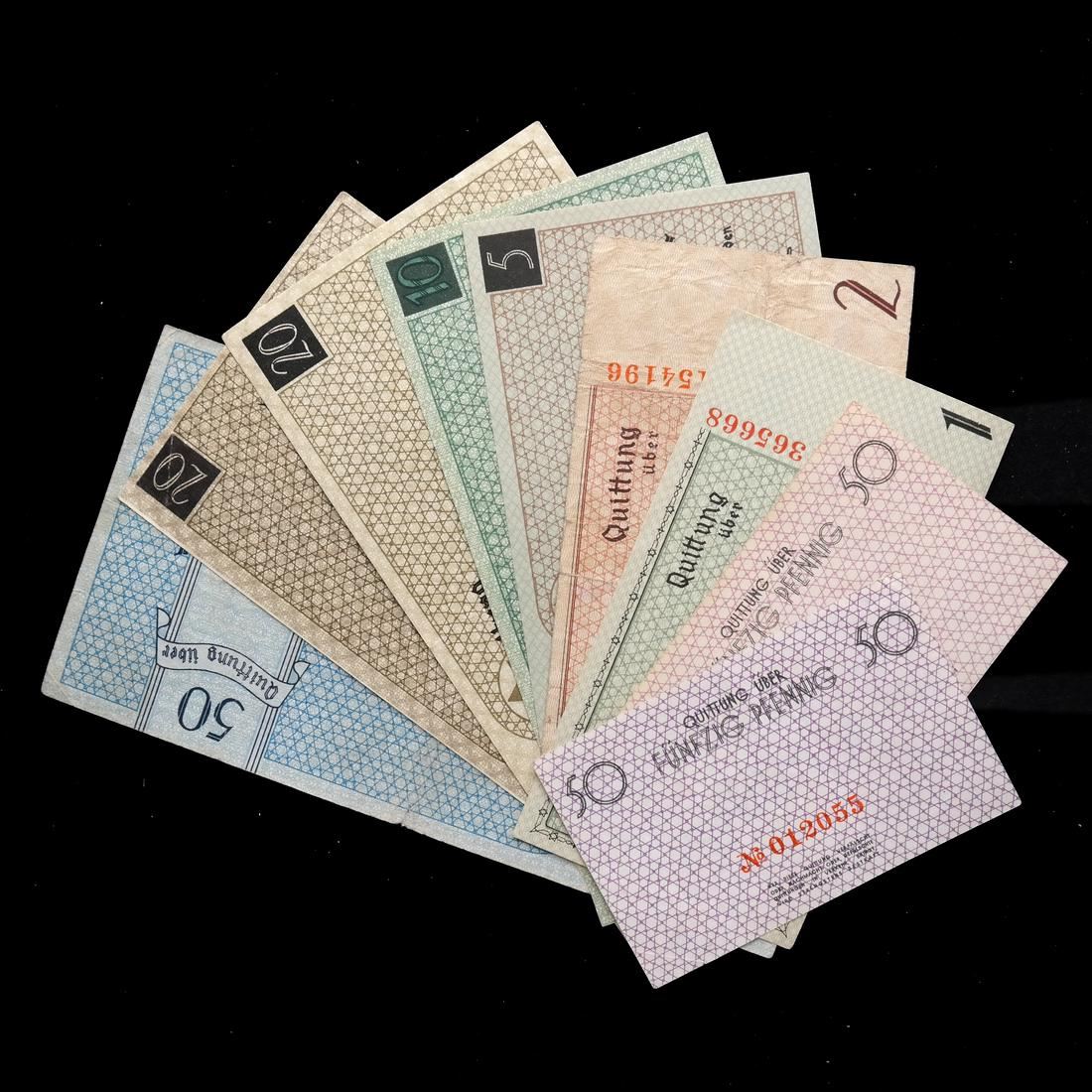 Includes 50pf orange serial #012055 XF to About Uncirculated, 50pf red serial #862103 Uncirculated, 1M type II serial #A 365668 About Uncirculated, 2M serial #154196 Fine+ (creases and pinhole), 5M serial #837267 Uncirculated, 10M red serial #409969 About Uncirculated, 20M type I red serial #109941 About Uncirculated, 20M type II red serial #278212 Extremely Fine, and 50M serial #026574 Very Fine (creases and one small edge tear).