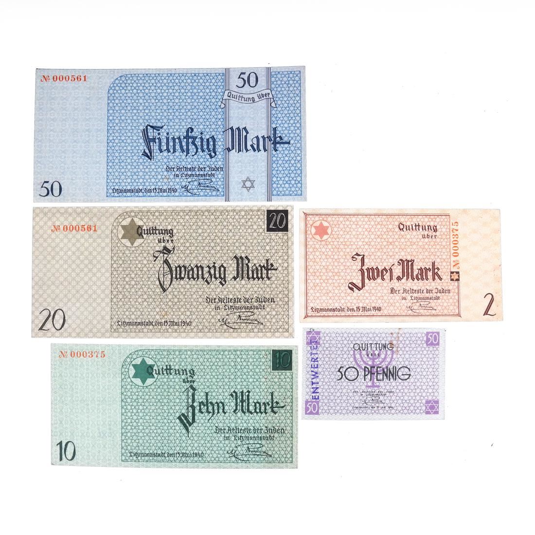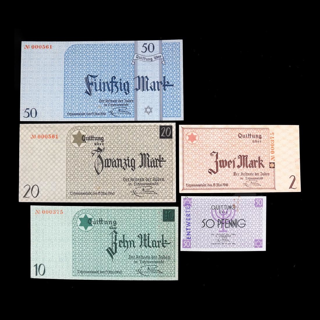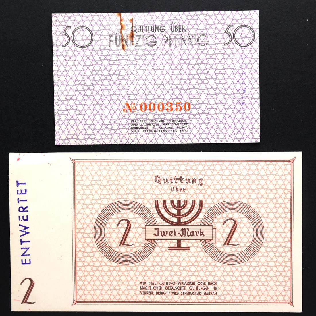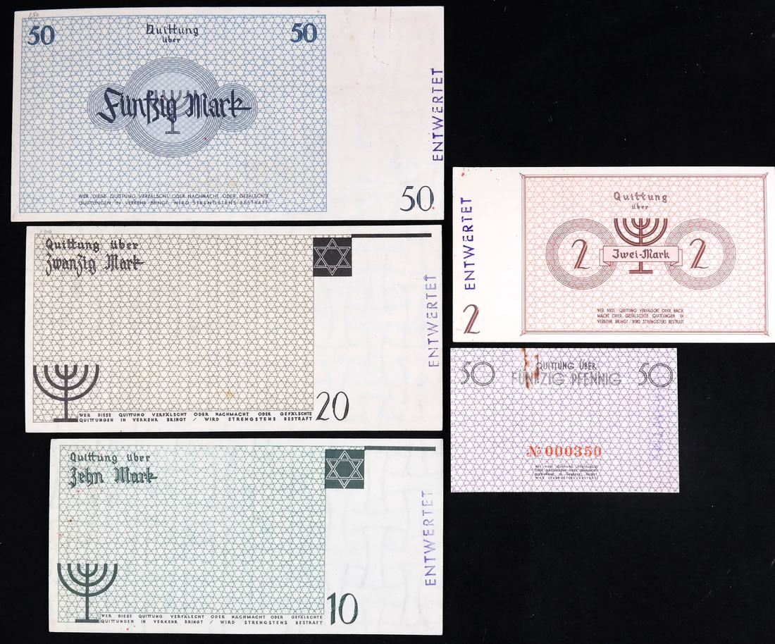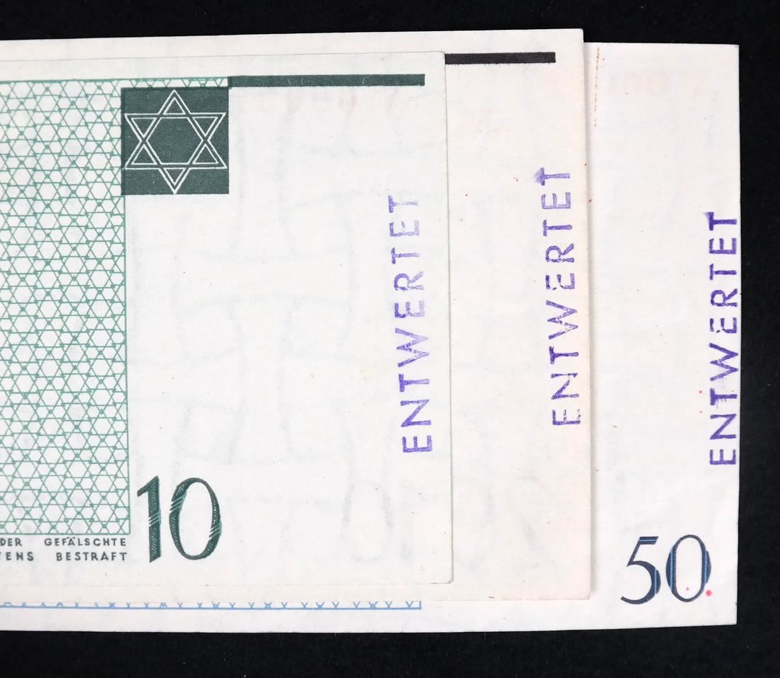Examples of the 50pf serial #000350 (paperclip rust stain), 2M serial #000375, 10M serial #000375, 20M serial #000561 and 50M serial #000561(faint paperclip rust stain), each with violet ENTWERTET handstamp, About Uncirculated to Uncirculated.
