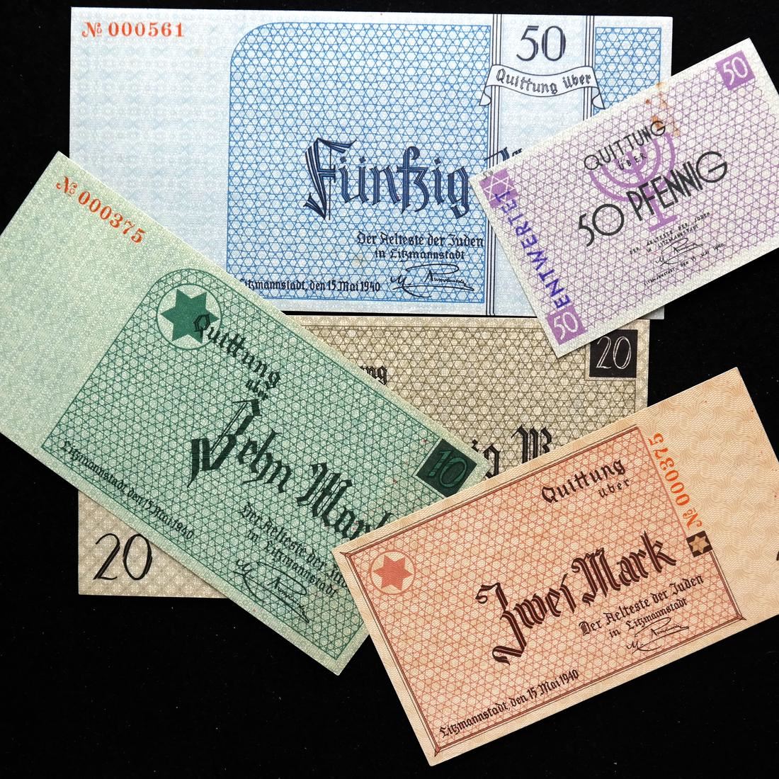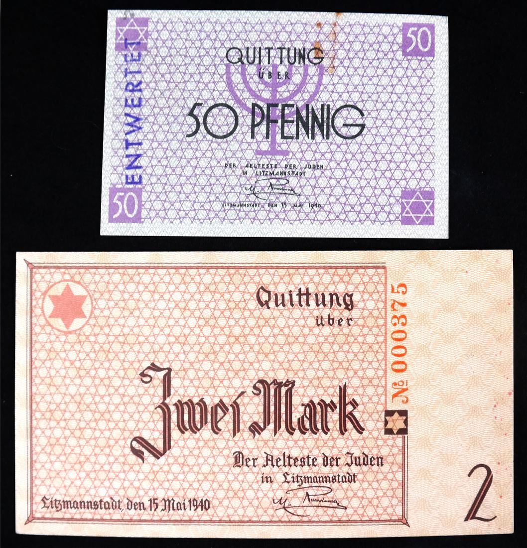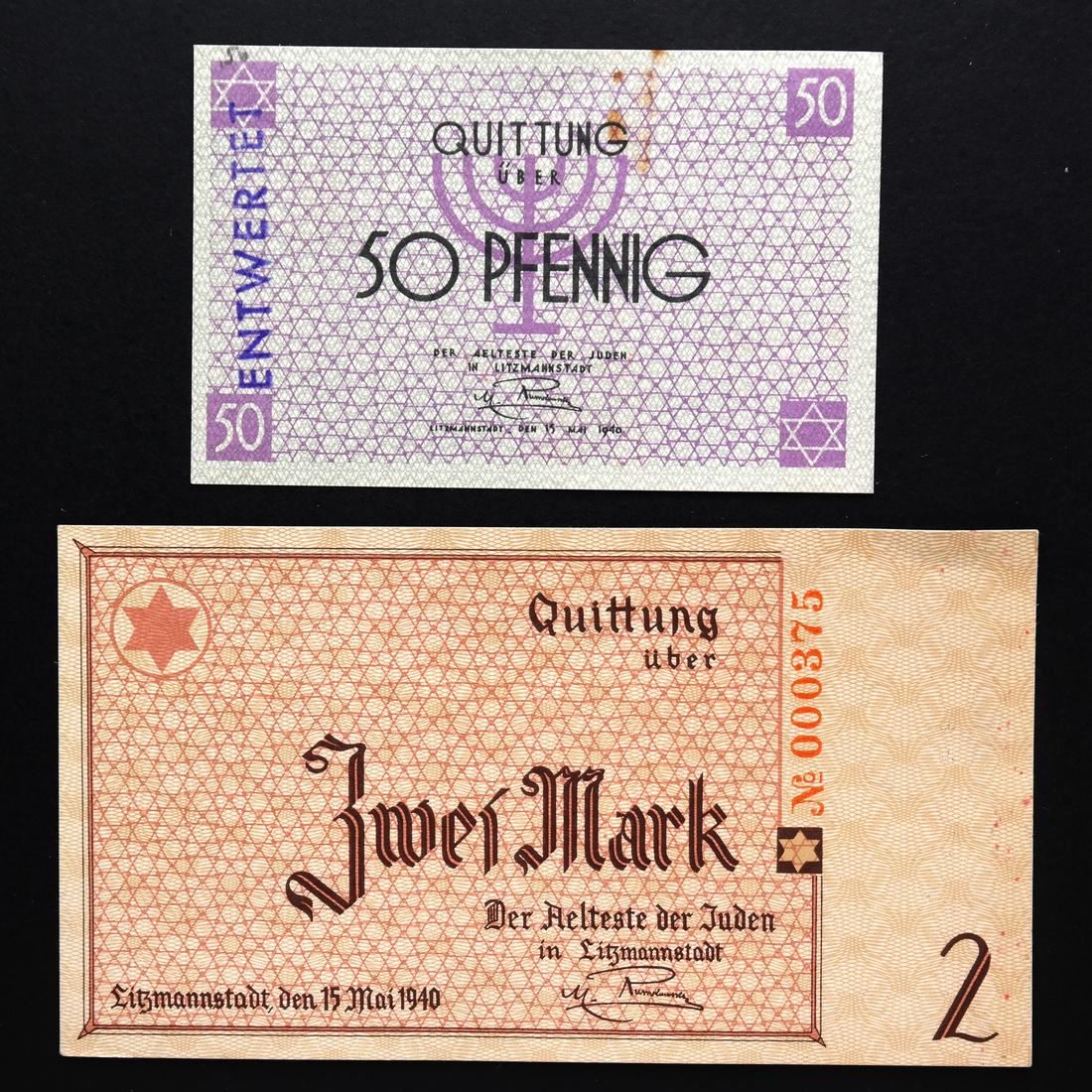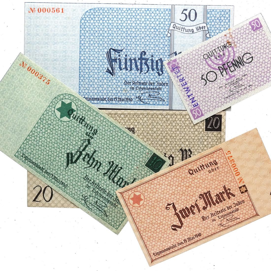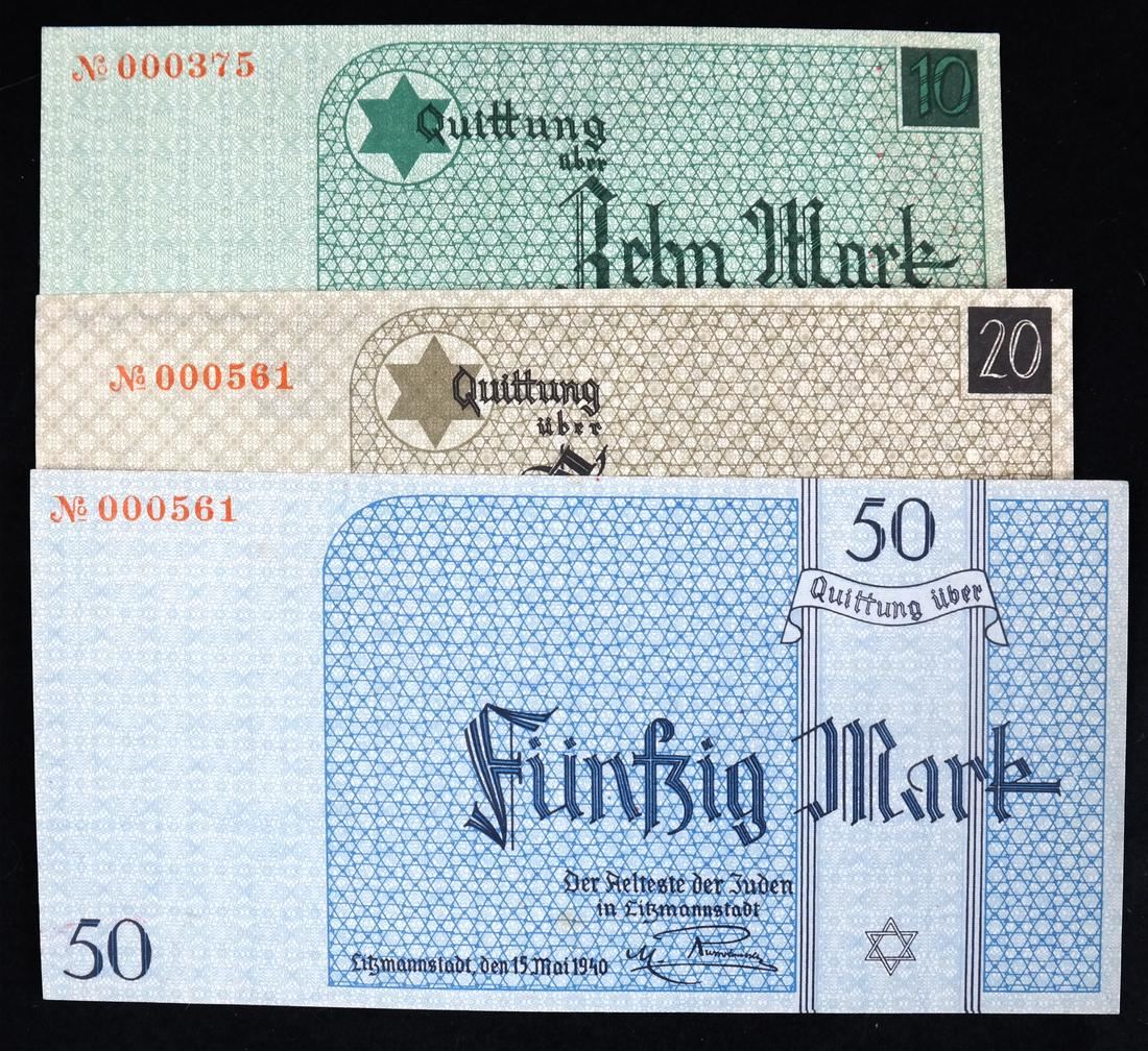 Examples of the 50pf serial #000350 (paperclip rust stain), 2M serial #000375, 10M serial #000375, 20M serial #000561 and 50M serial #000561(faint paperclip rust stain), each with violet ENTWERTET handstamp, About Uncirculated to Uncirculated.