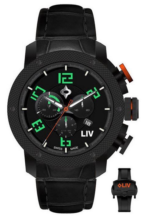 Model: 1210.45.80.A201.D100 - CASE = [Material:316L Stainless Steel with Black IP Coating], [Case Diameter:45], [Case Thickness:14.25mm], [Bezel:316L Stainless Steel with Black IP Coating], [Case Back:Solid Screwed Down (with screws)], [Water Resistant:300 Meters - 1000 Feet], [Crystal:Scratch Resistant Sapphire], DIAL = [Color:Black], MOVEMENT = [Type:Chronograph Battery Powered Quartz], [Crown:Screwed Down], BAND = [Clasp:Deployment Buckle], [Type:Black Alligator Leather], (In Stock - Ready to ship.)