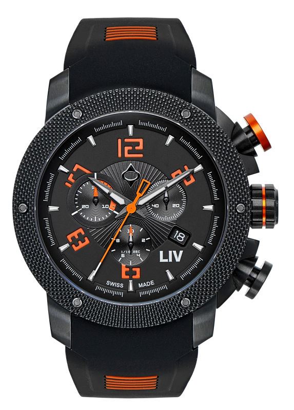 Model: 1210.45.10.SRB100 - CASE = [Material:PVD Black Steel], [Case Diameter:45], [Case Thickness:14.25mm], [Bezel:PVD Black Steel], [Case Back:Solid Screwed Down (with screws)], [Water Resistant:300 Meters - 1000 Feet], [Crystal:Scratch Resistant Sapphire], DIAL = [Color:Black], MOVEMENT = [Type:Chronograph Battery Powered Quartz], [Crown:Screwed Down], BAND = [Clasp:Pin & Buckle], [Type:Black Silicone Rubber (8 in Length (20.3 cm)], (In Stock - Ready to ship.)