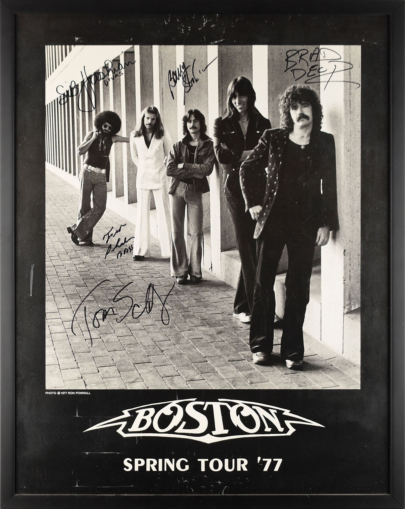 Sib Hashian's promotional poster for Boston's Spring Tour of 1977, 21.5 x 27.5, showing the band posing against a concrete structure, signed in black felt tip by Brad Delp, Tom Scholz, Barry Goudreau, Fran Sheehan, who adds "Bass," and Sib Hashian, who adds "Drums." Framed to a slightly larger size. In very good to fine condition, with creasing, primarily to the upper and lower borders.