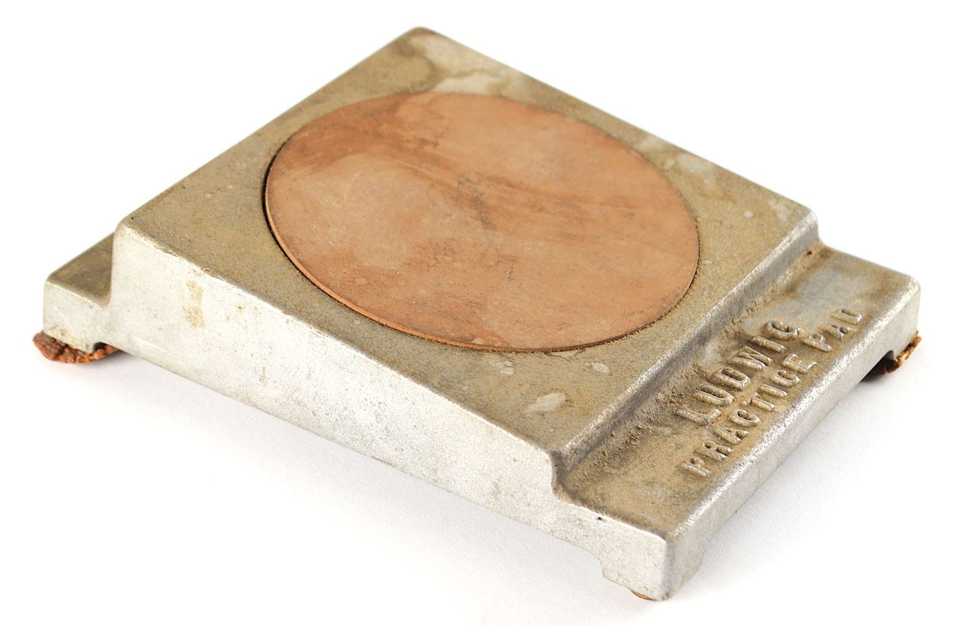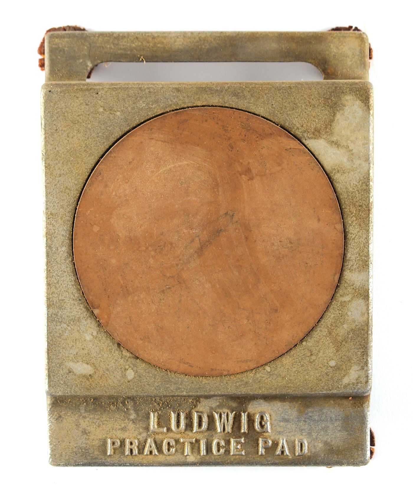 Sib Hashian's well-loved Ludwig practice pad which he used during his youth and beyond, measuring 6? x 8? x 2?, featuring a cast metal body, wingnut stand attachment on the bottom, brown rubber pad at center, and three heavily worn rubber feet (the fourth is missing). This was the first thing that Hashian practiced drums on during his youth, which soon led to his success: in his early teens, he earned money drumming to help support his family. Then, while attending Lynn English High School at age 15, Hashian began performing with future Boston bandmate Barry Goudreau, playing seven sets a night, seven nights a week. In very good condition, with some rust and other signs of age and use.