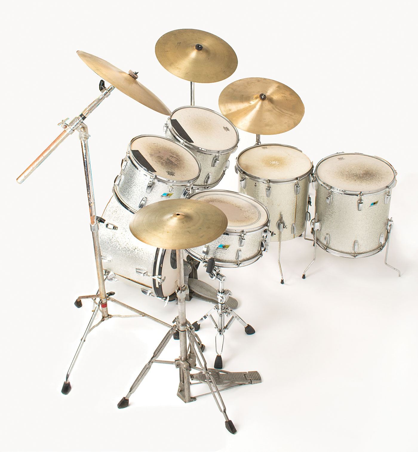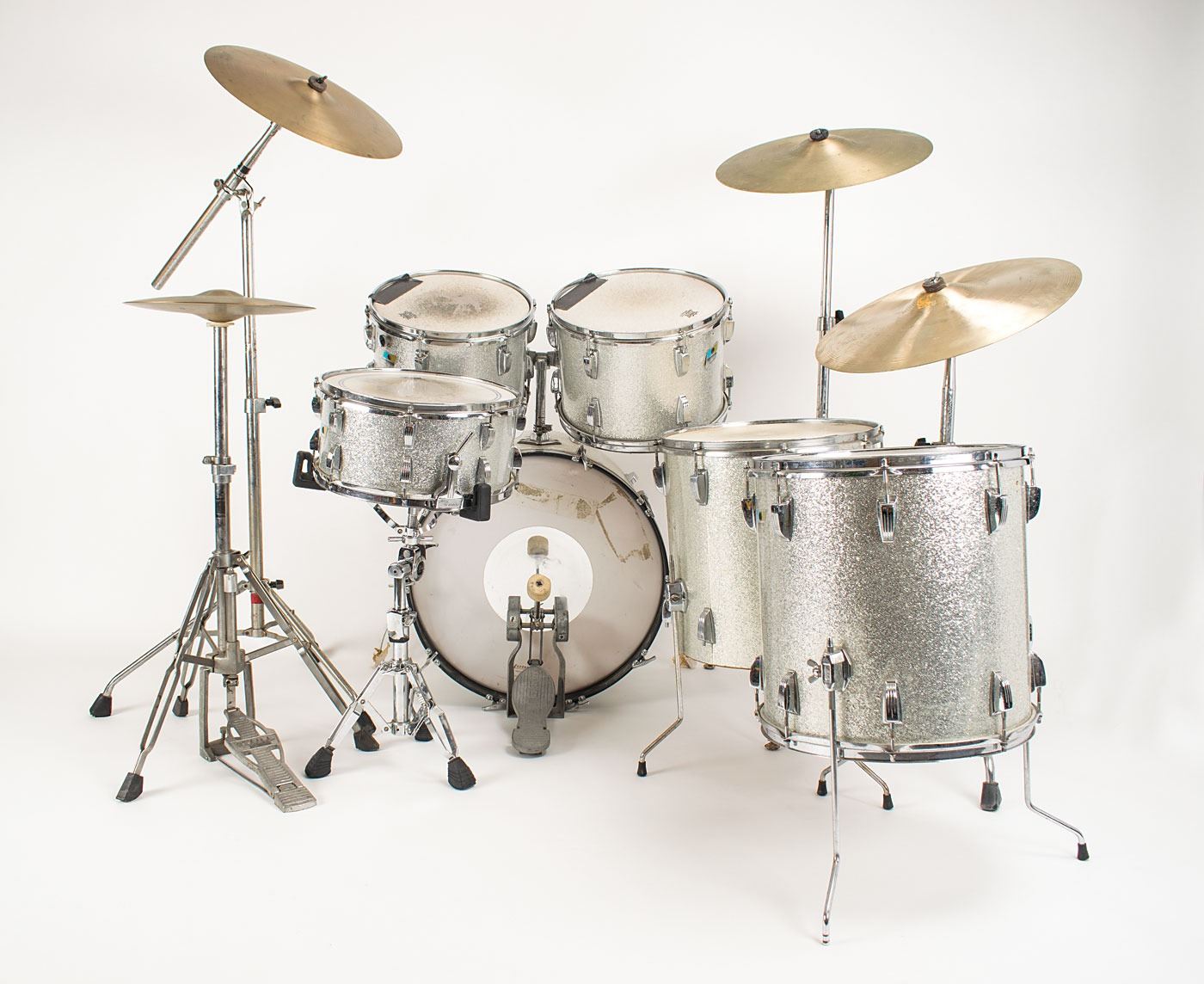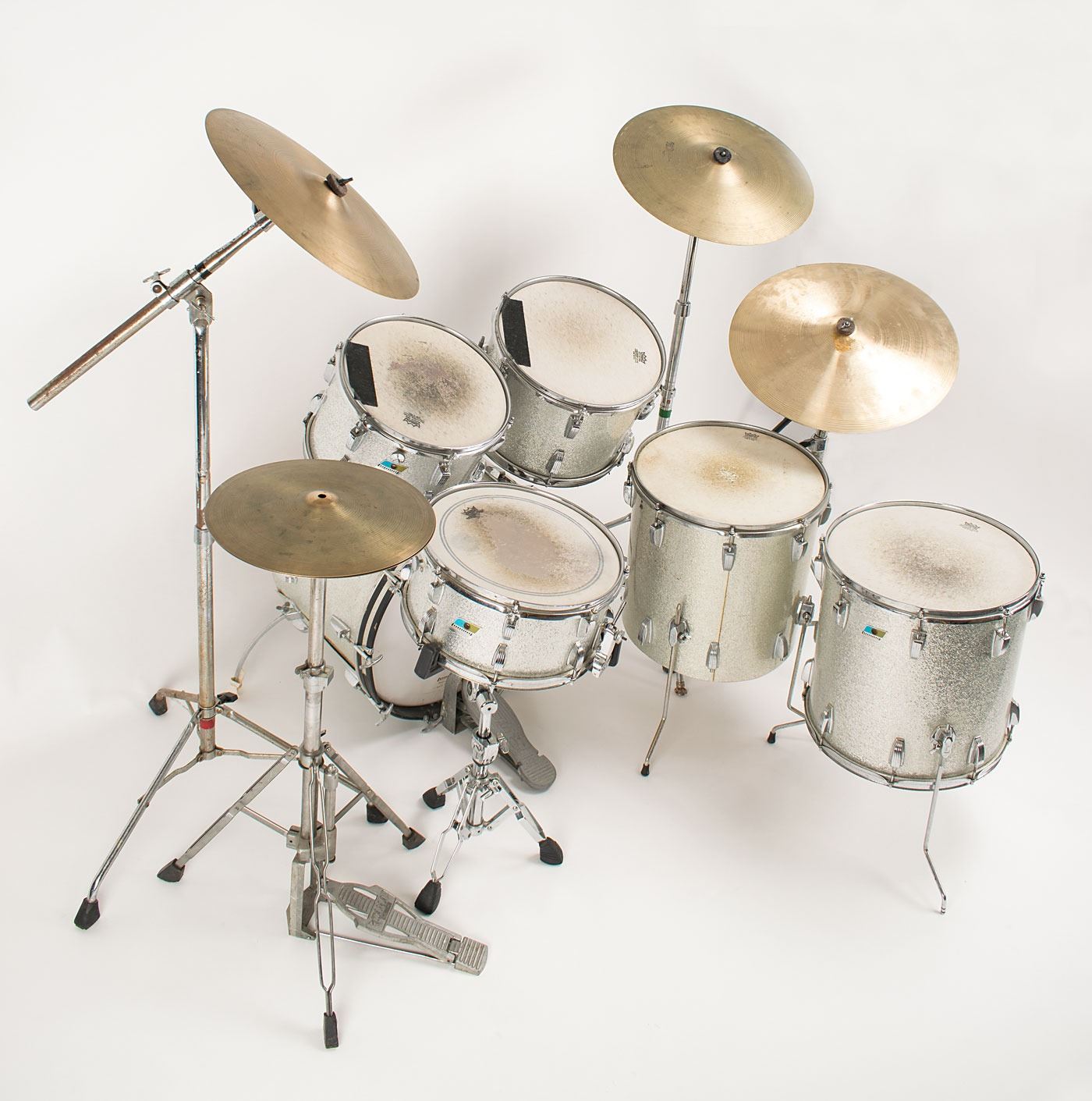 Sib Hashian's stage-used silver sparkle Ludwig drum kit played on his first two tours with Boston, featuring a bass drum with kick pedal, snare drum, high tom, mid tom, and two floor toms, plus high hat cymbals, two ride cymbals, and a crash cymbal, all with their stands. The blue-and-olive Ludwig badges have serial numbers that date the drums to 1969–1970. The drums are fitted with white Remo Weather King drumheads, all of which show heavy wear from use. Includes their road cases, all of which are stenciled "Boston" or feature the Boston logo.