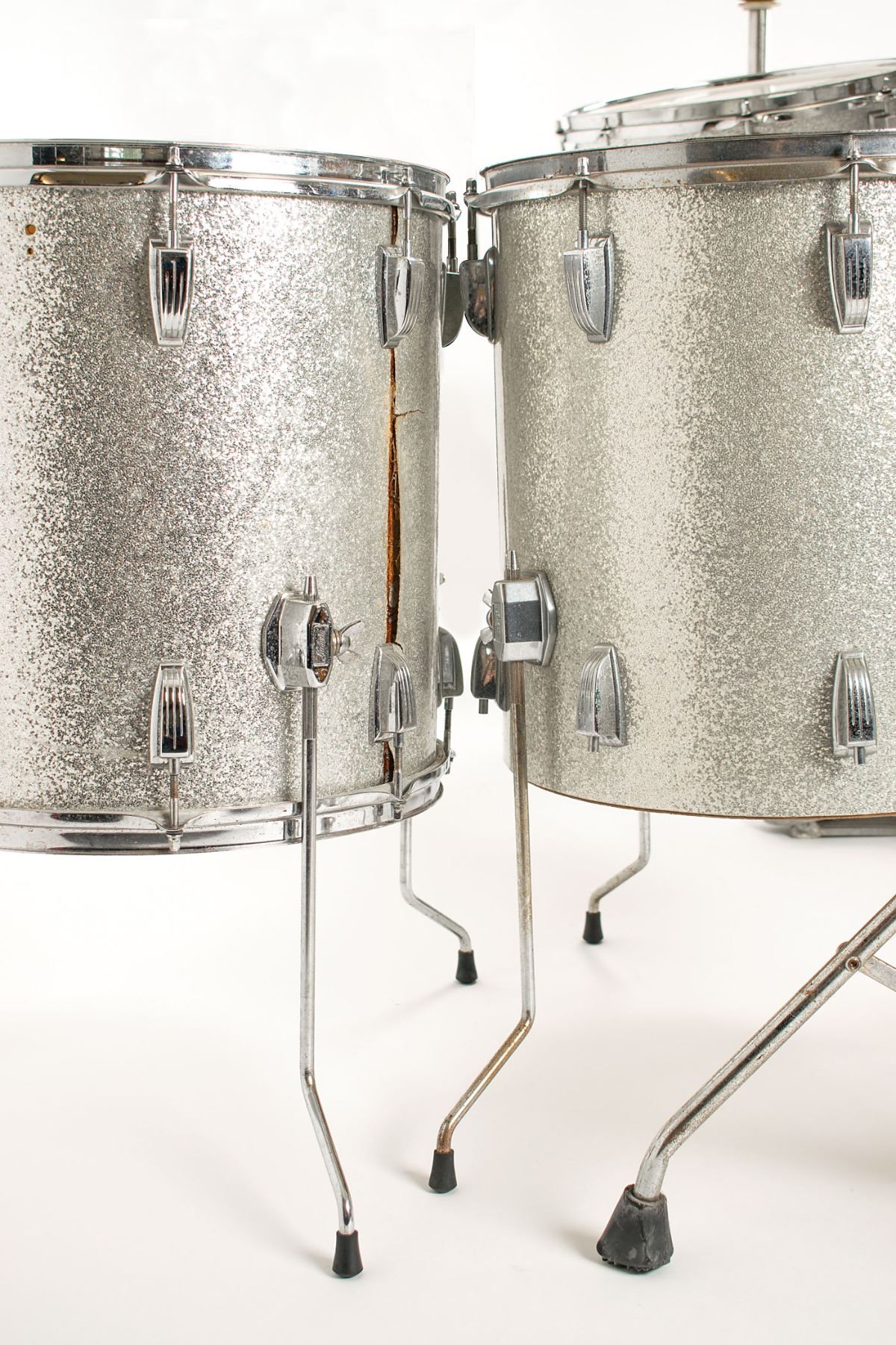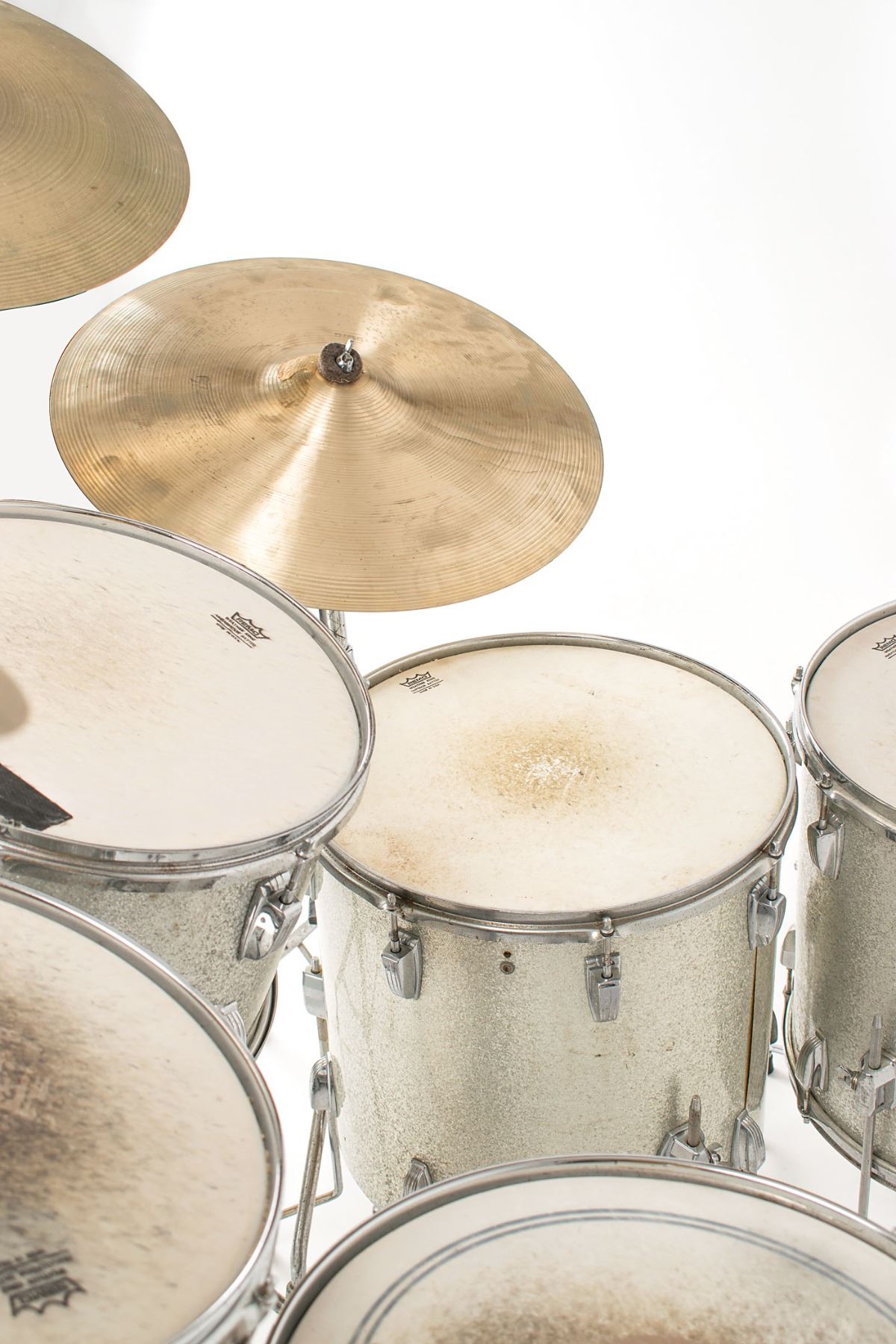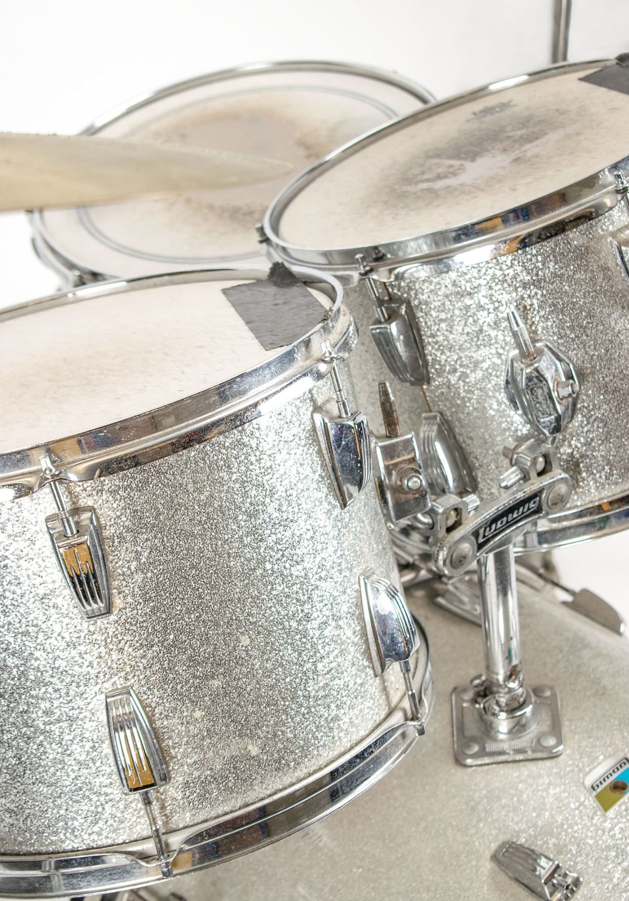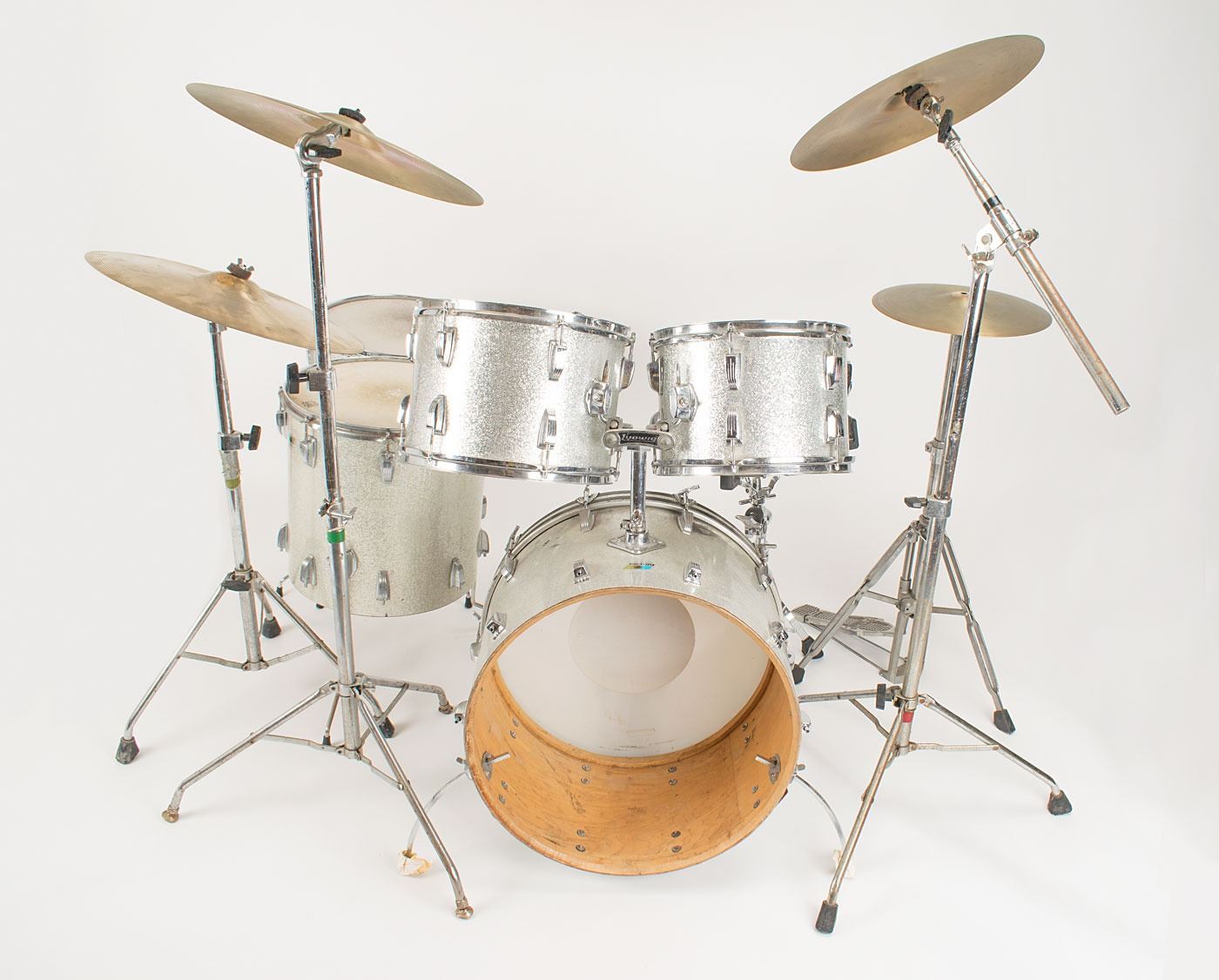 Sib Hashian's stage-used silver sparkle Ludwig drum kit played on his first two tours with Boston, featuring a bass drum with kick pedal, snare drum, high tom, mid tom, and two floor toms, plus high hat cymbals, two ride cymbals, and a crash cymbal, all with their stands. The blue-and-olive Ludwig badges have serial numbers that date the drums to 1969–1970. The drums are fitted with white Remo Weather King drumheads, all of which show heavy wear from use. Includes their road cases, all of which are stenciled "Boston" or feature the Boston logo.