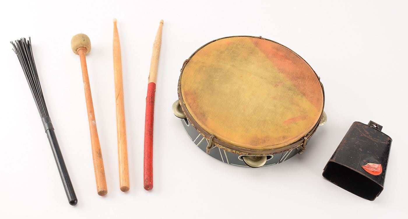 Sib Hashian's collection of percussion equipment used on tour with Boston, which includes: a 5? inch Latin Percussion cowbell; a 13.5? inch Rayburn Music TS-12 drum mallet; a 15? inch Calato Blastick drum brush; a 16? inch Vic Firth drumstick; a 16? inch Sib Hashian "personal model" drumstick by E.U. Wurlitzer; and a wooden 10? in diameter single-row tambourine with hand-painted rim and matching leather case. In overall very good to fine condition, with expected wear from use, including chips to sticks and bell and toning to tambourine skin.