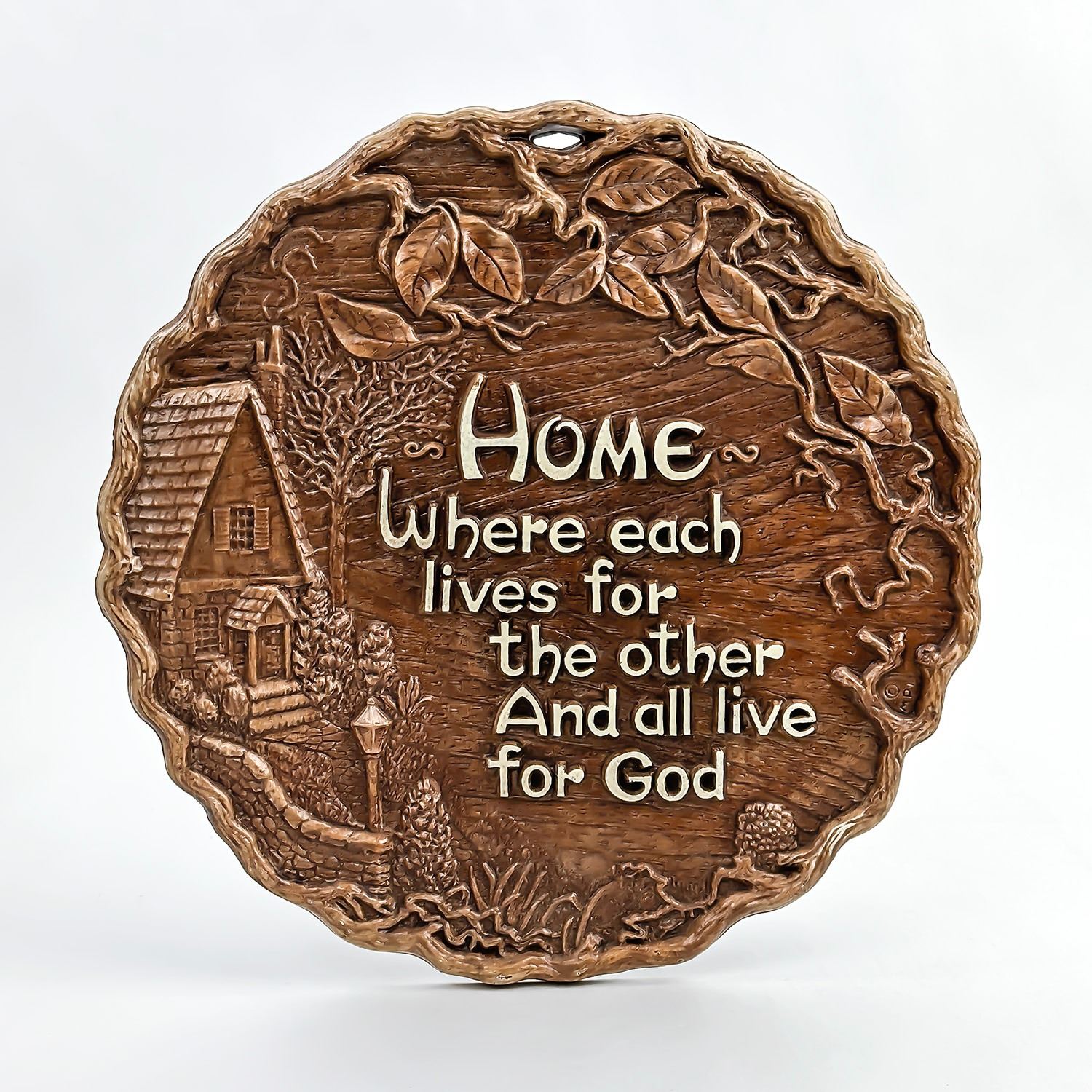 #8280 - VINTAGE RELIGIOUS WALL PLAQUE. FAUX WOOD SCULPTURE BY MULTI PRODUCTS INC. HOME WHERE EACH LIVES FOR THE OTHER AND ALL LIVE FOR GOD. MEASURES: 10” (25.5 CM) DIAMETER