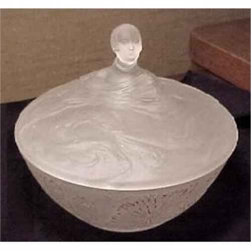 Known as LIZ, shown and desctibed on pages 28-29 of Whitmyer this Art Deco frosted glass powder jar features a li with a lady torso finial. Swirling all around her are scarves amidst a floral design. The powder jar measures 5 1/2" tall x 5 1/2" in diameter and is in excellent condition.