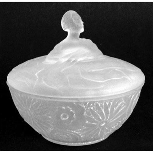 Known as LIZ, shown and desctibed on pages 28-29 of Whitmyer this Art Deco frosted glass powder jar features a lid with a lady torso finial. Swirling all around her are scarves amidst a floral design. The powder jar measures 5 1/2 inches tall x 5 1/2 inches in diameter and is in excellent condition.