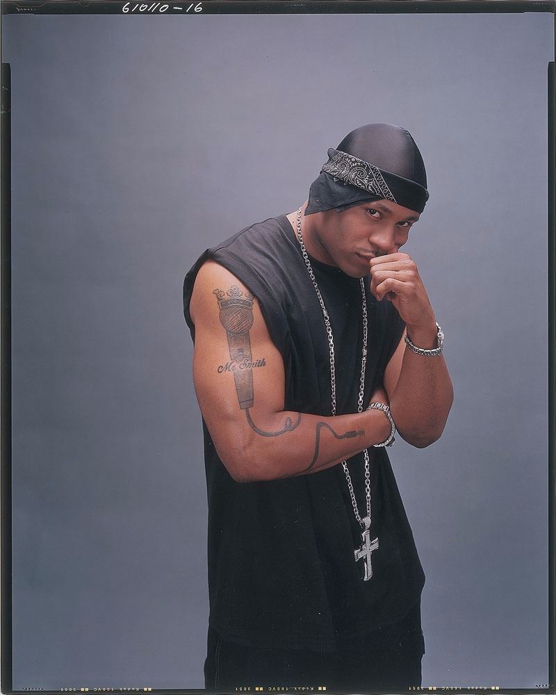 Original color glossy 8 x 10 half-length photo of LL Cool J wearing a bandana with do-rag and a large chain with cross. Reverse bears "Kodak Professional" watermarks. In fine condition. From the Globe Photo archives.