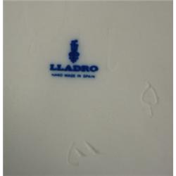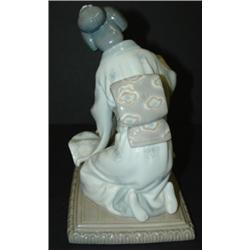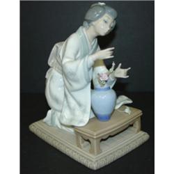 LLADRO FIGURINE OF ORIENTAL LADY kneeling with vase and flowers. Marked Lladro on bottom and J-24A. Thumb on right hand is broken. 7.5" H