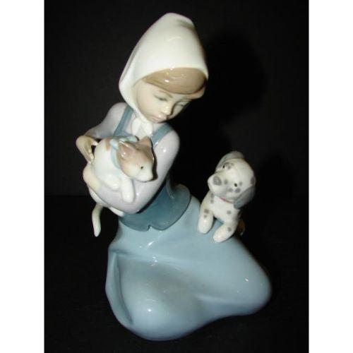“DOG AND CAT” LLADRO FIGURINE. No. 5032. Depicts a girl holding a cat with a small dog at her side. Marked on bottom. 7” H