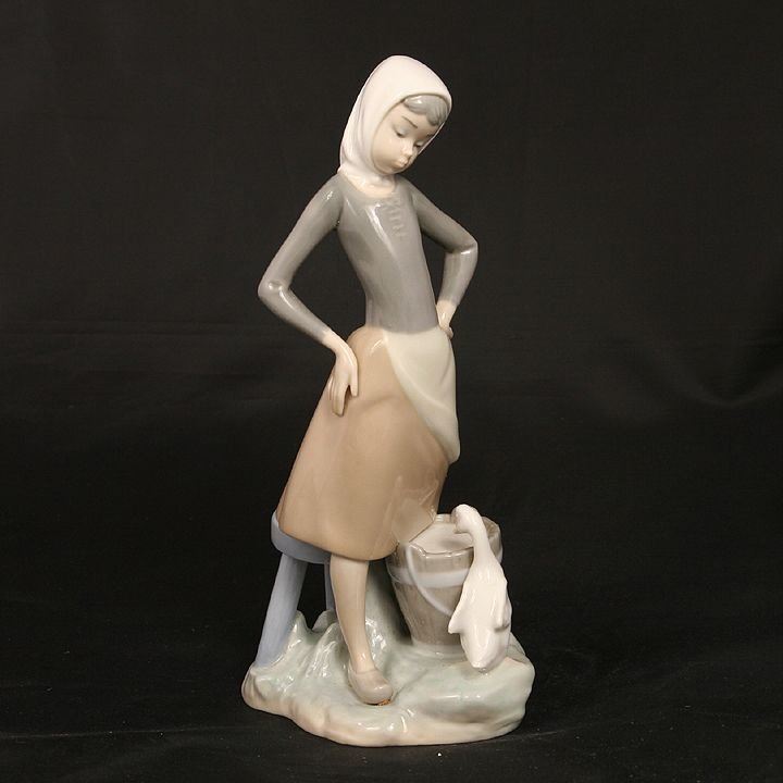 This lovely glazed finish porcelain figurine designed by Lladro sculptor Vicente Martinez was issued in 1970 with the Spanish name Lecherita Patito Feo and retired in 1990. Stands approx. 9 ½ inches (24 cm) tall.