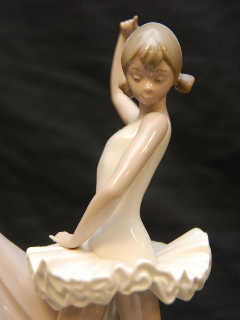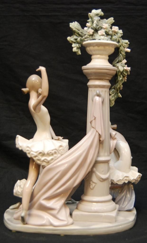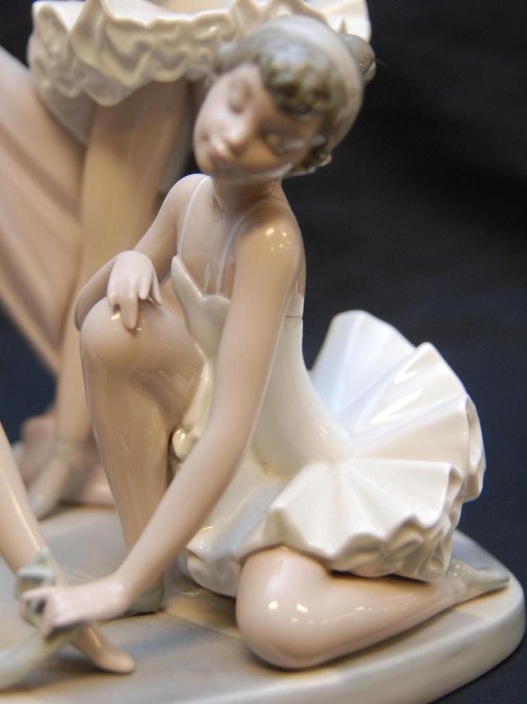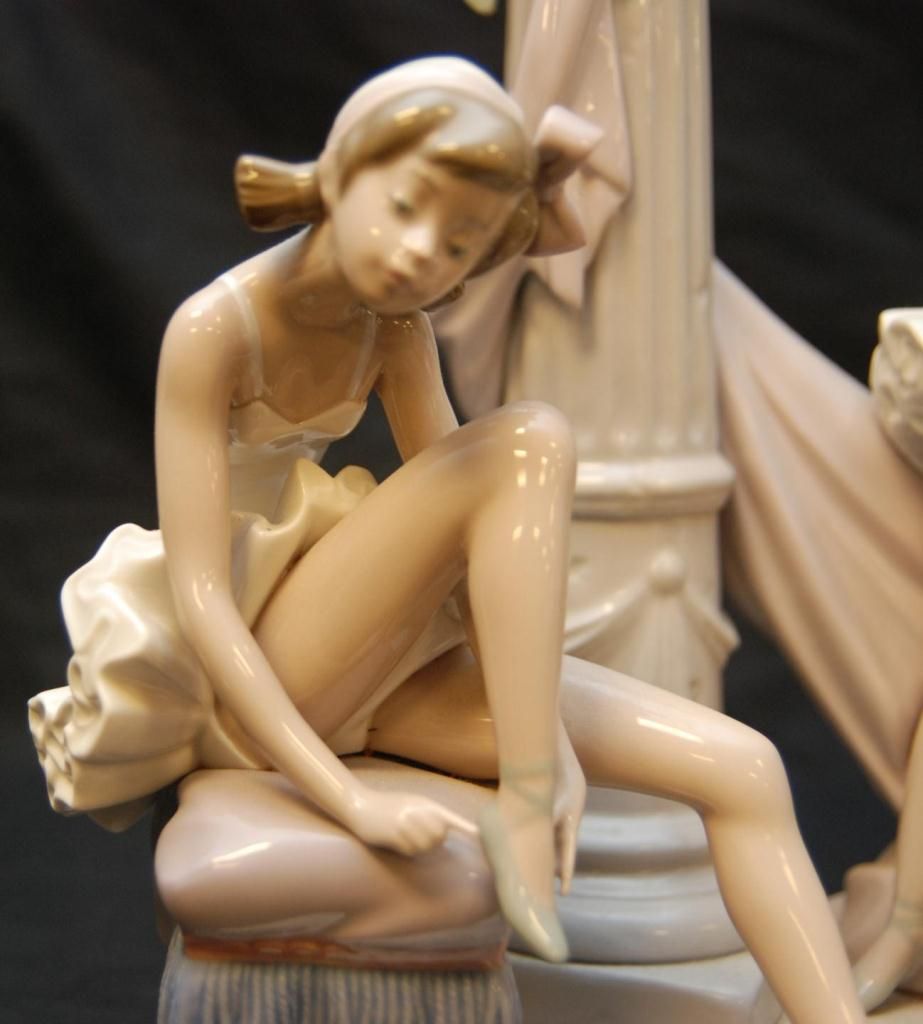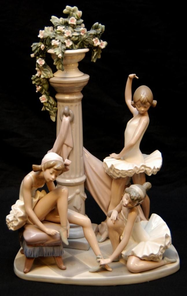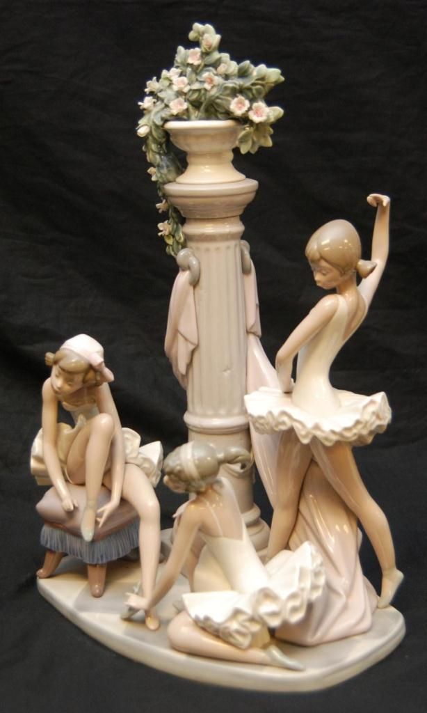 Lladro Spanish glazed porcelain figure depicting three ballerinas. Titled 'Ballet Trio' or 'Antes del Ensayo'. Number 5235. Retired 1998. Measures 17" height (43.1cm). Total weight of 4.32 kilograms.