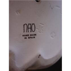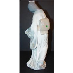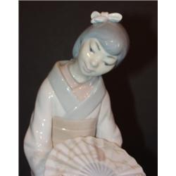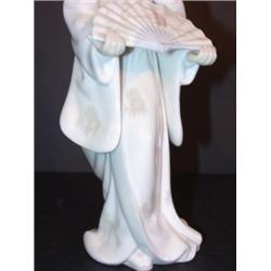 Lladro style statuette of young lady with fan. Marked on bottom NAO-Hand Made in Spain. 10" H