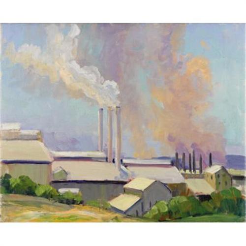 <B>LLOYD GOFF (1908-1982)</B></I><BR>Untitled Industrial Scene<BR>Oil on canvas<BR>18 x 22 inches (45.7 x 55.9 cm)<BR>Unsigned, accompanied by certification by the executor of the Lloyd Goff Estate<BR><BR> The current exhibition at the Panhandle Plains Museum, <I>Urban Texas: Changing Images of an Evolving State,</B></I> shows Texas artists increasingly depicted the urbanization of the state as economic and population growth began to transform Texas from a mainly agrarian society. Regionalist artists like Lloyd Goff, who were coming of age in the late 1920s and 1930s, were the generation first affected by these changes. In this painting, Lloyd Goff explores the pictorial possibilities of a large industrial plant. He uses the geometric arrangement of the buildings and smokestacks as a strong design element. He plays these strong linear elements against the organic design elements of billowing smoke in the sky and bushes in the foreground. The resulting painting is a masterpiece of light, color, and form.<BR><BR>Provenance:<BR>Estate of Lloyd Goff<B>Condition Report:</B> Relined with minor scattered inpainting. Unframed.<BR><BR><b>Shipping:</b> Requires 3rd Party Shipping (<a target="_blank" href="http://www.heritageauctions.com/common/shipping.php">view shipping information</a>)