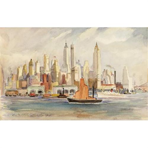 <B>LLOYD GOFF (1908-1982)</B></I><BR><I>Rio Grande Valley/Lower Manhattan</B></I>, 1940<BR>Watercolor on paper<BR>15-1/4 x 22-1/4 inches (38.7 x 56.5 cm)<BR>Signed and dated lower right<BR>Titled lower left<BR><BR> A fabulously executed double-sided watercolor of the very different worlds that Lloyd Goff lived and painted; the rural landscape of West Texas and New Mexico, and on the other side, the New York metropolis.<BR><BR>Provenance:<BR>Estate of Lloyd Goff<B>Condition Report:</B> Excellent condition. Unframed.<BR><BR><b>Shipping:</b> Requires 3rd Party Shipping (<a target="_blank" href="http://www.heritageauctions.com/common/shipping.php">view shipping information</a>)