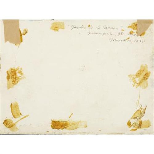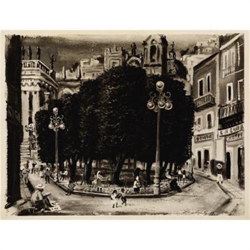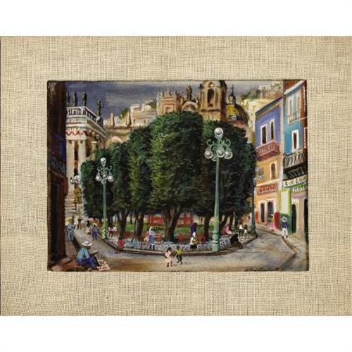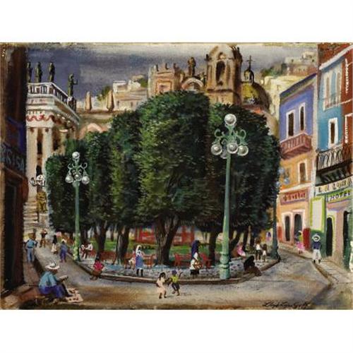 <B>LLOYD GOFF (1908-1982)<BR></B></I><I>Jardin de La Union, Guanajuato</B></I>, 1949<BR>Watercolor and gouache on paper<BR>11 x 15 inches (27.9 x 38.1 cm)<BR>Signed lower right<BR>Titled and dated verso<BR><BR> Exhibited at the Whitney Museum of Art, this gouache is another fine example of painting that Lloyd Goff did while in Mexico. The painting is wonderfully composed with bright and vivid color.<BR><BR>Provenance:<BR>Estate of Lloyd Goff<BR><BR>Exhibited:<BR>Whitney Museum of Art, 1954 Annual Exhibition of Contemporary American Sculpture, Watercolors and Drawings<BR><BR><B>Condition Report:</B> Excellent condition. Matted/unframed.<BR><BR><b>Shipping:</b> Requires 3rd Party Shipping (<a target="_blank" href="http://www.heritageauctions.com/common/shipping.php">view shipping information</a>)
