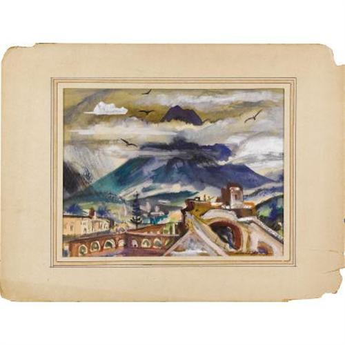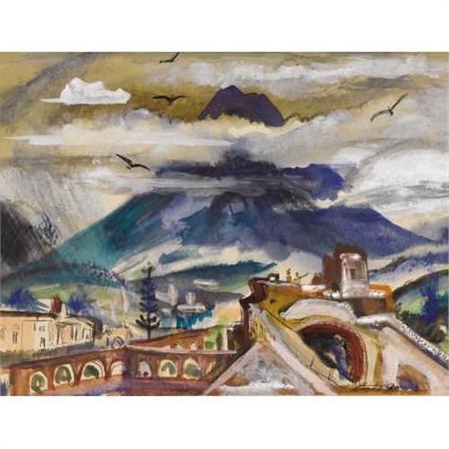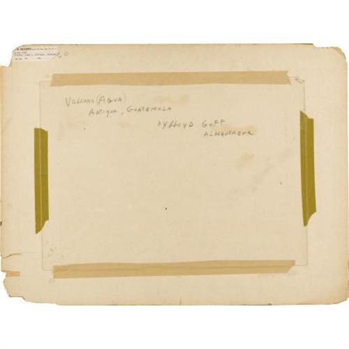 <B>LLOYD GOFF (1908-1982)</B></I><BR><I>Volcano (Agua) Antiqua, Guatemala</B></I>, 1940s<BR>Watercolor and gouache on paper<BR>13 x 17 inches (33.0 x 43.2 cm)<BR>Signed lower right<BR>Titled verso<BR><BR> A vibrant and active watercolor, the verso reveals it was shown and exhibited at the Kraushaar Gallery on 57th Street in New York City. In the first half of the 1900s, Kraushaar was one of the most prestigious and respected galleries in the United States. Goff's inclusion as a gallery artist reveals the wide acclaim and recognition he had achieved as an artist, not only in Texas, but in New York and in the rest of the country.<BR><BR>Provenance:<BR>Estate of Lloyd Goff<BR><BR>Exhibited:<BR>Kraushaar Gallery Exhibition (label verso)<B>Condition Report:</B> Excellent condition. Unframed.<BR><BR><b>Shipping:</b> Requires 3rd Party Shipping (<a target="_blank" href="http://www.heritageauctions.com/common/shipping.php">view shipping information</a>)