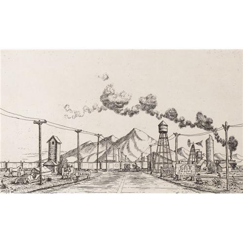 <B>LLOYD GOFF (1908-1982)</B></I><BR><I>Lordsburg, NM,</B></I> 1940<BR>Etching<BR>Signed lower right<BR>Signed and titled lower left<BR><BR>Lloyd Goff is quite the storyteller in this etching. He chronicals the roadside kitsch found typical of many small New Mexico towns along Route 66 headed west.<BR><BR>The artist in his own hand wrote, <I>rare etching,</B></I> at the bottom margin of the sheet.<BR><BR>Provenance:<BR>Estate of Lloyd Goff<BR><BR> <B>Condition Report:</B> Excellent condition. Unframed.<BR><BR><b>Shipping:</b> Requires 3rd Party Shipping (<a target="_blank" href="http://www.heritageauctions.com/common/shipping.php">view shipping information</a>)