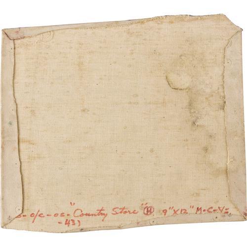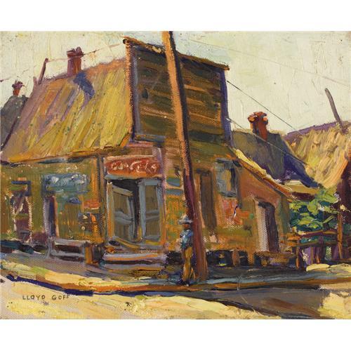 <B>LLOYD GOFF (1908-1982)</B></I><BR><I>Country Store,</B></I> late 1920s to early 1930s<BR>Oil on unstretched canvas<BR>9in. x 12in.<BR>Signed lower left<BR>Titled verso<BR><BR>A light-filled canvas of an old country store with shadows of early morning or late afternoon sunlight. A solitary figure rests in the shade propped-up against the leaning utility pole.<BR><BR>This canvas retains a freshness and state of preservation not normally seen in paintings near eighty years old. This is due to having been stacked unstretched beneath other works, and thus protected from the effects of oxidation, vibration, and light.<BR><BR>Provenance:<BR>Estate of Lloyd Goff<BR><BR> <B>Condition Report:</B> Excellent condition. Unframed.<BR><BR><b>Shipping:</b> Requires 3rd Party Shipping (<a target="_blank" href="http://www.heritageauctions.com/common/shipping.php">view shipping information</a>)