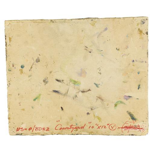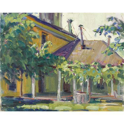 <B>LLOYD GOFF (1908-1982)</B></I><BR><I>Courtyard,</B></I> late 1920s to early 1930s<BR>Oil on canvasboard<BR>10in. x 12in.<BR>Unsigned, accompanied by certification from the executor of the Lloyd Goff Estate<BR>Titled verso<BR><BR>The word "courtyard" generally evokes the idea of an elegant garden with perhaps some statuary. In this painting, Lloyd Goff depicts a courtyard of a simple pioneer cabin with wooden porch (dog run), a well, and a tangle of vines. The edifice is probably the original structure and the building to the left was probably a later addition.<BR><BR>Provenance:<BR>Estate of Lloyd Goff<BR><BR> <B>Condition Report:</B> Excellent condition. Unframed.<BR><BR><b>Shipping:</b> Requires 3rd Party Shipping (<a target="_blank" href="http://www.heritageauctions.com/common/shipping.php">view shipping information</a>)