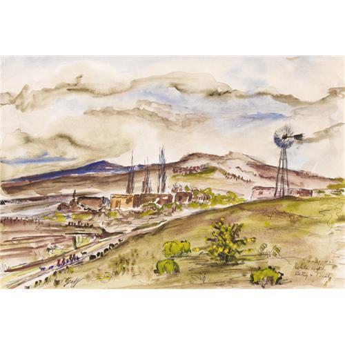 <B>LLOYD GOFF (1908-1982)</B></I><BR><I>Isleta (with Betty and Dial),</B></I> 1945<BR>Watercolor and pen<BR>9 1/2in. x 13 1/2in.<BR>Signed lower left<BR>Dated and titled verso<BR><BR>A delightful watercolor and pen of Isletta Pueblo, which has been continuously inhabited since 1300 A.D.<BR><BR>Provenance:<BR>Estate of Lloyd Goff<BR><BR> <B>Condition Report:</B> Excellent condition. Unframed.<BR><BR><b>Shipping:</b> Requires 3rd Party Shipping (<a target="_blank" href="http://www.heritageauctions.com/common/shipping.php">view shipping information</a>)