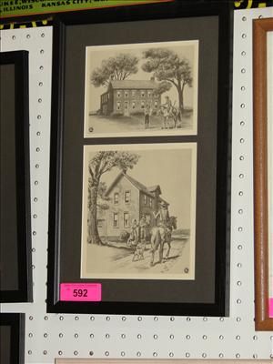 PAIR OF LLOYD OSTENDORF ABE LINCOLN SURVEYING PRINTS. NICELY FRAMED. MEASURES 17.5 X 11.5. AS SHOWN. VIEW PICTURE FOR DETAIL.