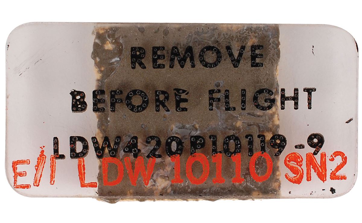 Small clear plastic LM protective cover with a Velcro swatch affixed to the reverse, 2 x 1, bearing black text reading, “Remove Before Flight, LDW420P10119-9,” and red text, “E/I LDW 10110SN2.” In fine condition.