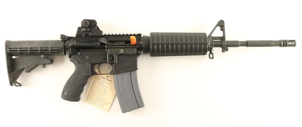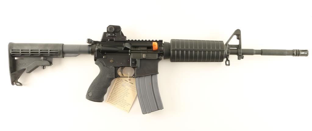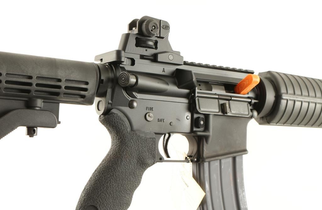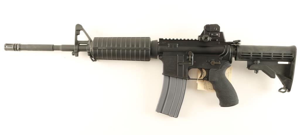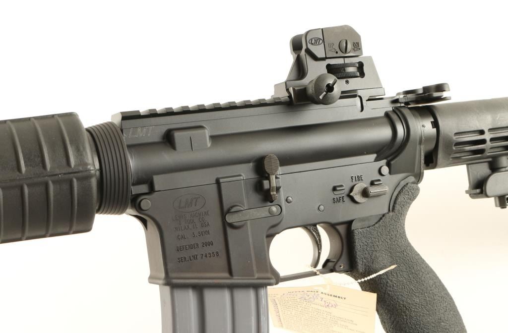 'Lewis Machine & Tool Co.' Top of the line AR platform semi-automatic rifle chambered in 5.56mm Nato. Features a matte black finish, cryogenically treated 16" chrome lined 1:7 M4 barrel, birdcage flash hider, A2 front sight with bayonet lug, flat top receiver, LMT adjustable dual aperture sight, 30 round magazine, AR-15 BCG, shell deflector, forward assist, dust cover, sling swivels, standard carbine handguard, six position collapsible buttstock and LMT rubber over-molded finger groove pistol grip. Includes the original factory box with sling & documents. Rifle shows very little to no wear. Action is crisp, bore is pristine and stocks are fine. Condition is as new in box. ***Modern Firearm***