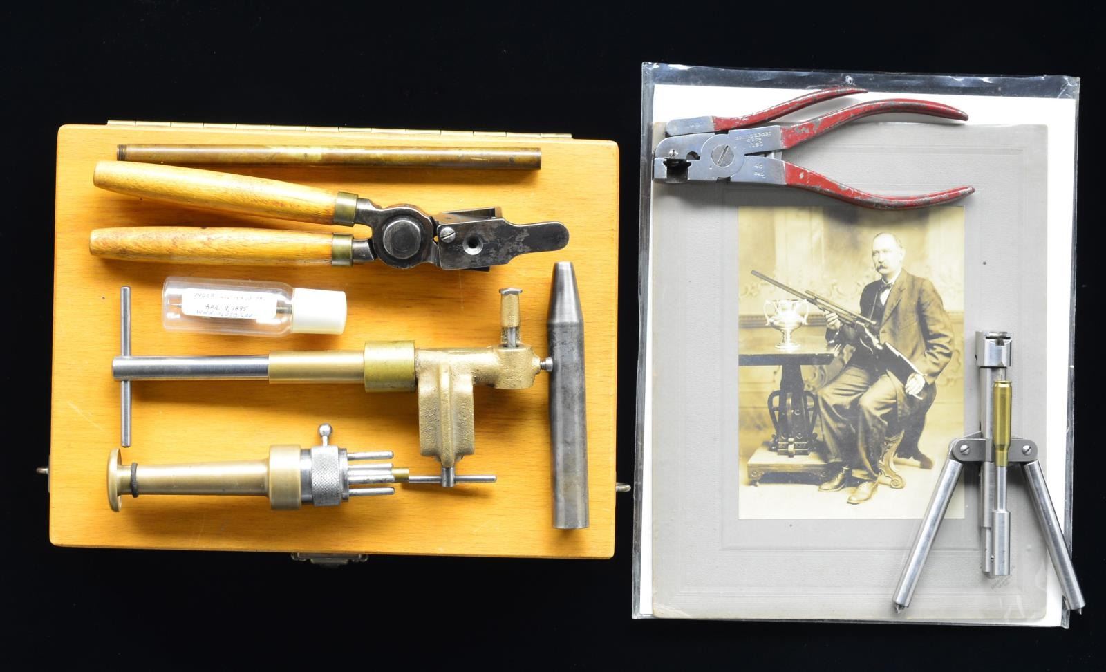 SINGLE SHOT TARGET RIFLE. 1) Tools are housed in a 10-3/4" x 8" x 2-1/2" wooden box. Tools consist of 32-40 bullet mold w/ Pope style conversion plate, Pope style bullet lubrication pump, patch cutter, drop tube, an unidentified adj. punch & unmarked 32-40 false muzzle w/ bullet starter. Also includes a photograph of an unidentified gentleman shooter holding a High-Wall Schuetzen rifle. CONDITION: box & tools are in good used condition. (02-13903/DS). 2) C.S. Pool Decapper & priming tool in Cal. 222 Rim. CONDITION: very good. (02-13904/DS). 3) Bridgeport GI CO No. L185 40 Cal. priming tool. False muzzle & starter are serial number "409". CONDITION: cleaned metal showing spots of light pitting. Handles have worn brown paint. (02-13905/DS). $600-1,000.