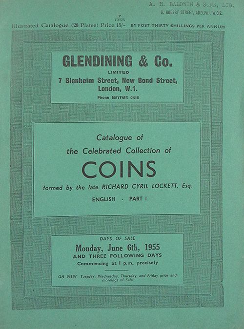 Glendining & Co. CATALOGUE OF THE CELEBRATED COLLECTION OF COINS FORMED BY THE LATE RICHARD CYRIL LOCKETT, ESQ. ENGLISH: PARTS I-IV / CONTINENTAL / SCOTTISH AND IRISH: PARTS I & II. London, 1955-60. Seven catalogues. Small 4to, original printed card covers. Portrait; (12), 155, (5), 168, (2), (8), 112, (2), 90, (2), 83, (1), 84, (2), 35, (1) pages; 4249 + 710 + 968 lots; 28 + 77 + 39 + 25 + 20 + 18+ 26 + 8 fine plates. English Part V has printed prices realized alongside lots. Very good to fine. A monumental series of sales, indispensable to collectors and students of English and Continental hammered coins. Clain-Stefanelli 5036, 5364, 6142, 6155 and 11274. Grierson 298.